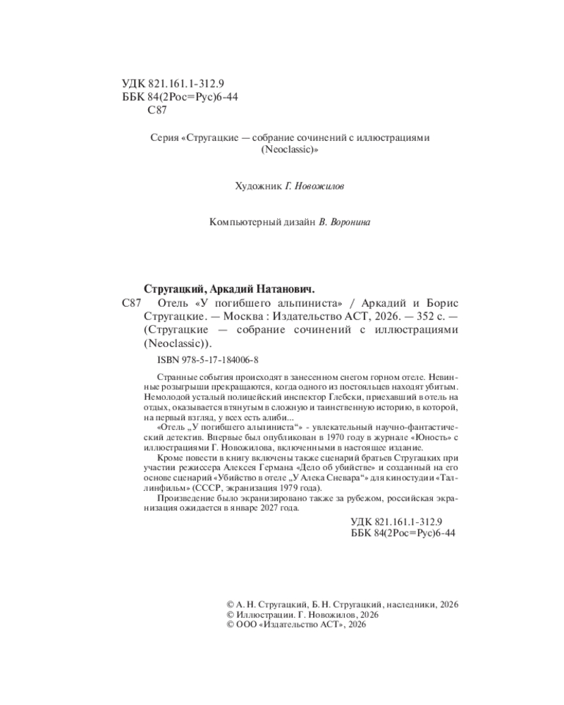 💳 Оплатить за товар можно при получении 🇰🇿 Есть бесплатная доставка по Казахстану от 1 дня 🎁 Копите бонусы с каждой покупки Серия: Стругацкие — собрание сочинений с иллюстрациями (Neoсlassic) Странные события происходят в занесенном снегом горном отеле. Невинные розыгрыши прекращаются, когда одного из постояльцев находят убитым. Немолодой усталый полицейский инспектор Глебски, приехавший в отель на отдых, оказывается втянутым в сложную и таинственную историю, в которой, на первый взгляд, у всех есть алиби... |