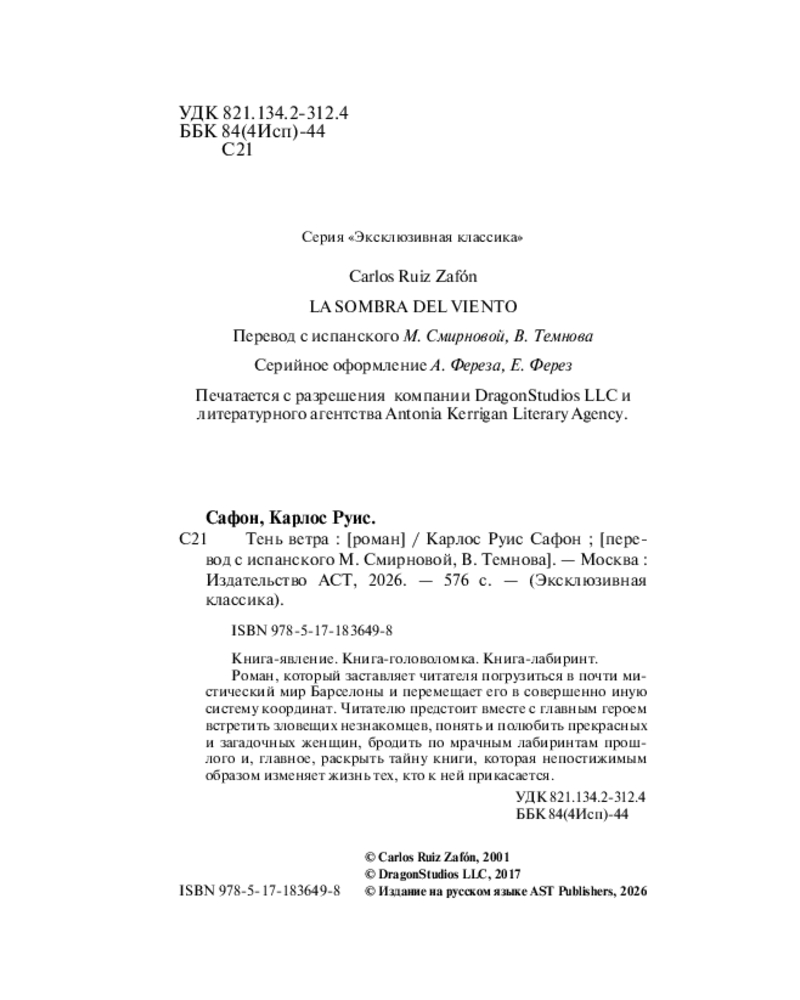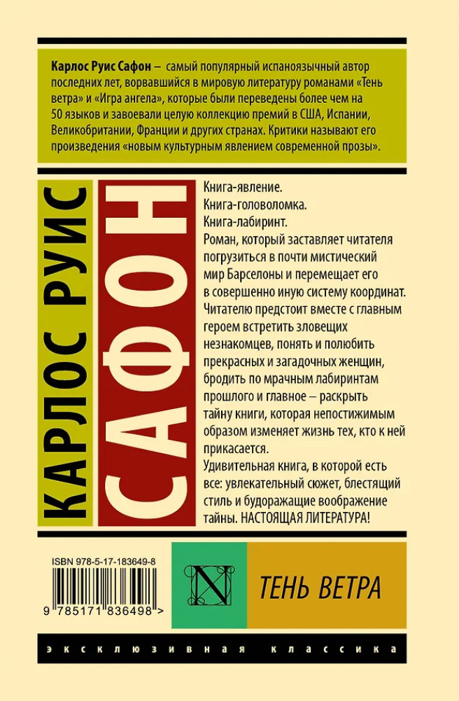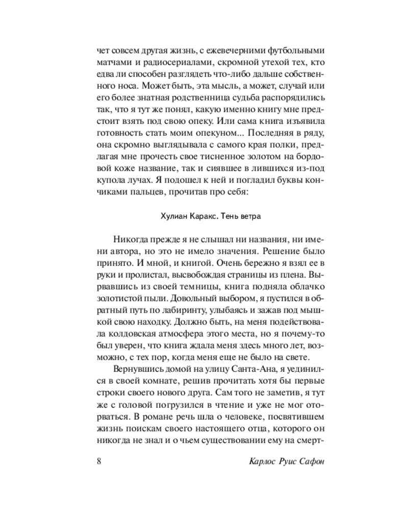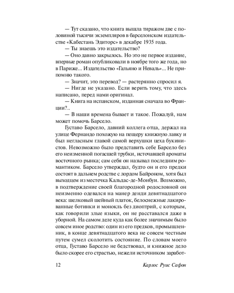 💳 Оплатить за товар можно при получении 🇰🇿 Есть бесплатная доставка по Казахстану от 1 дня 🎁 Копите бонусы с каждой покупки Серия: Эксклюзивная классика. Лучшее Книга-явление. Книга-головоломка. Книга-лабиринт. Роман, который заставляет читателя погрузиться в почти мистический мир Барселоны и перемещает его в совершенно иную систему координат. Читателю предстоит вместе с главным героем встретить зловещих незнакомцев, понять и полюбить прекрасных и загадочных женщин, бродить по мрачным лабиринтам прошлого, и главное — раскрыть тайну книги, которая непостижимым образом изменяет жизнь тех, кто к ней прикасается. |