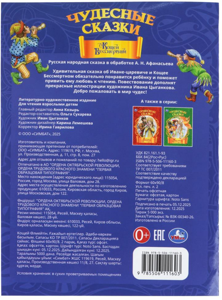 💳 Оплатить за товар можно при получении 🇰🇿 Есть бесплатная доставка по Казахстану от 1 дня 🎁 Копите бонусы с каждой покупки Серия: Чудесные сказки Книга-брошюра «Кощей Бессмертный» из серии «Чудесные сказки» ТМ «УМка» — отличный подарок для ребёнка. Эта увлекательная история не оставит равнодушным ни одного малыша — захватывающий сюжет увлечёт ребёнка с первых же строк. Яркие, запоминающиеся иллюстрации художника Ивана Цыганкова превратят чтение в настоящее приключение: каждый разворот книги — как окно в сказочный мир, где оживают герои и происходят чудеса. Формат А4 идеально подходит для совместного чтения — текст хорошо читается, а картинки достаточно крупные, чтобы ребёнок мог разглядеть все детали. |