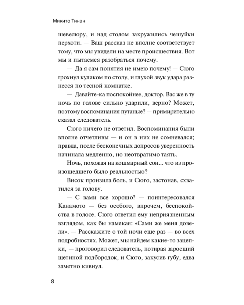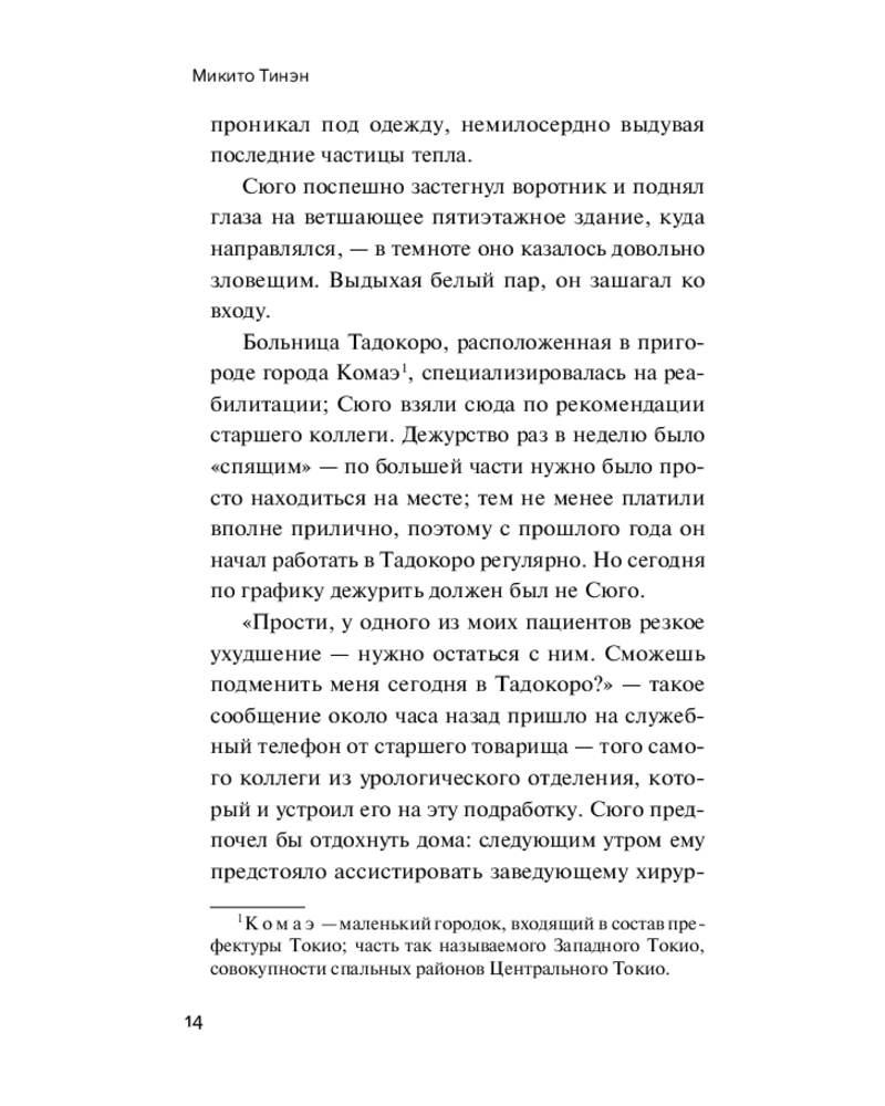 | Современный автор медицинский детективов. Он родился в префектуре Окинава в 1978 году и сейчас живет в Токио. Микито Тинэн окончил медицинский факультет университета Дзикэй и является сертифицированным врачом. В 2011 году он стал лауреатом 4-й премии Shimada Shoji Selection Rose no Machi Fukuyama в области детективной литературы за свой дебютный роман. |