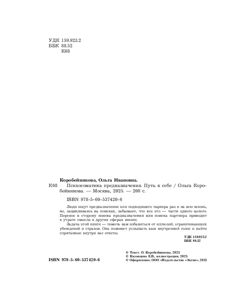 💳 Оплатить за товар можно при получении 🇰🇿 Есть бесплатная доставка по Казахстану от 1 дня 🎁 Копите бонусы с каждой покупки Серия: Библиотека Ольги Коробейниковой Ольга Коробейникова — Ph. D в области психосоматики, парадоксальный психолог, нутрициолог, аромапсихолог. Автор более 70 трансформационных курсов и 5 современных профессий. Автор игры «Квантовая матрица». Более 10 тыс. проведенных личных консультаций. Люди ищут предназначение или подходящего партнера один раз и на всю жизнь, но зацикливаясь на поисках, забывают, что все это — части одного целого. Перекос в сторону поиска предназначения или поиска партнера приводит к утрате смысла в других сферах жизни. Задача этой книги — помочь вам избавиться от иллюзий, ограничивающих убеждений и страхов. Она поможет услышать ваш внутренний голос и найти спрятанные внутри вас ответы. |