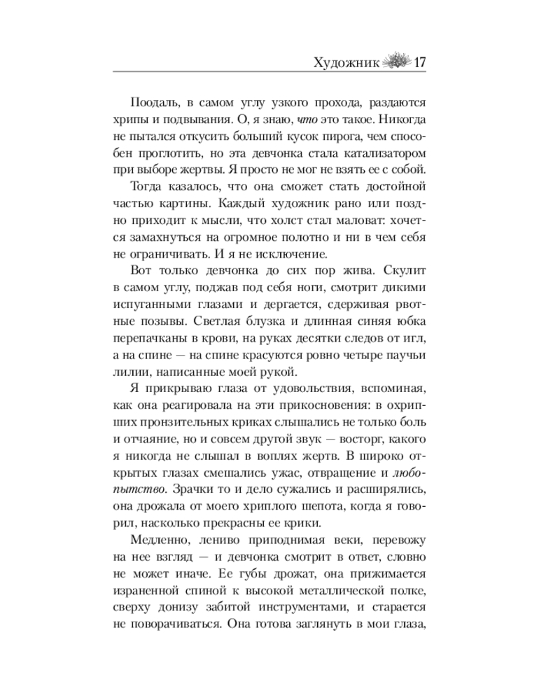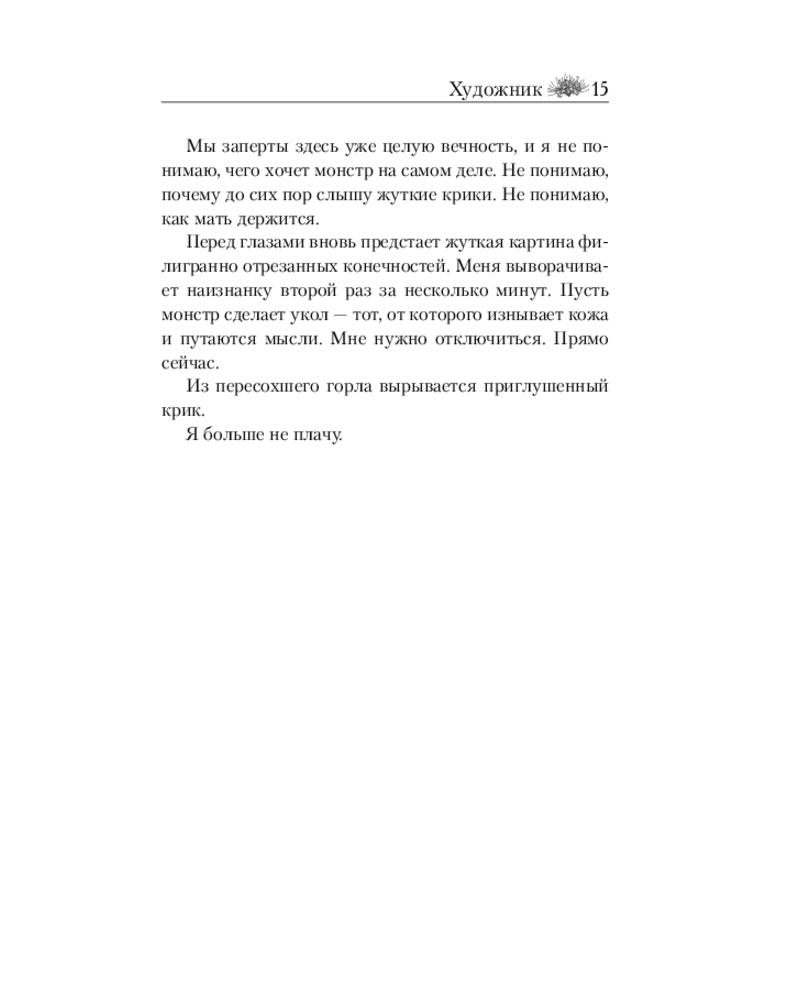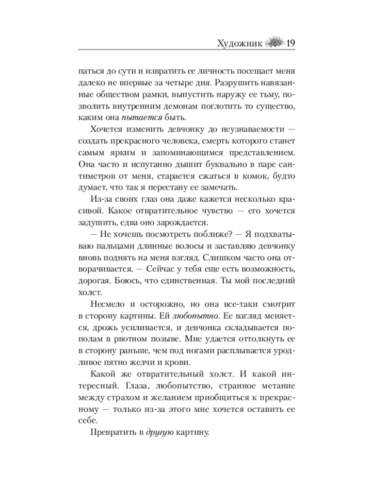Я единственная, кого Художник оставил в живых, и эта ошибка будет стоить ему жизни. Он заплатит за каждый шрам на моем теле, за каждый мой ночной кошмар. Если его не казнят, я приду за ним сама и загоню нож в его черное сердце. Но он выбирается из тюрьмы задолго до казни и теперь уже не остановится. Ведь я не просто его ошибка, я — его инструмент, его собственность, его идеальная картина. И мне от него не сбежать.