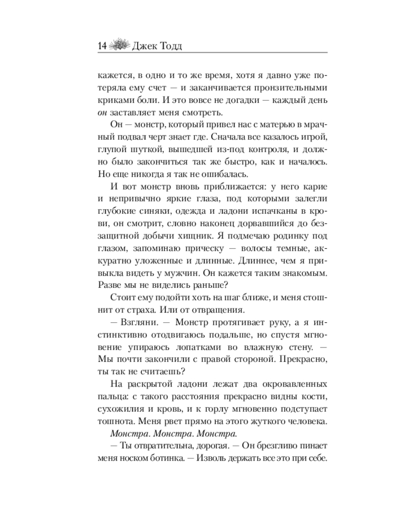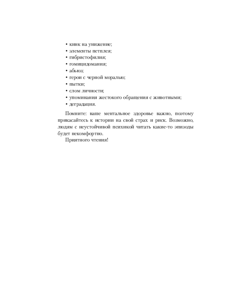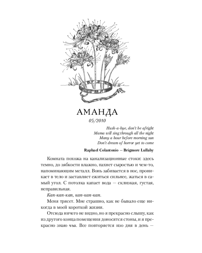 Я никогда не ошибаюсь, и Аманда — не исключение. Она поймет это, едва я сосчитаю до четырех. Раз. Она принадлежит мне с того самого момента, как я впервые ее увидел. Два. Я сломаю ее и соберу заново: медленно, методично, с особым наслаждением. Tри. Пусть кричит, сопротивляется, ненавидит меня, но мы оба знаем, чем все закончится. Она приползет ко мне и будет умолять продолжить. Четыре. Я ее Мастер, а она мой послушный инструмент. И так будет всегда. |