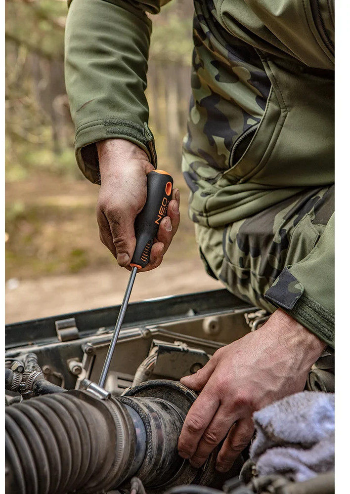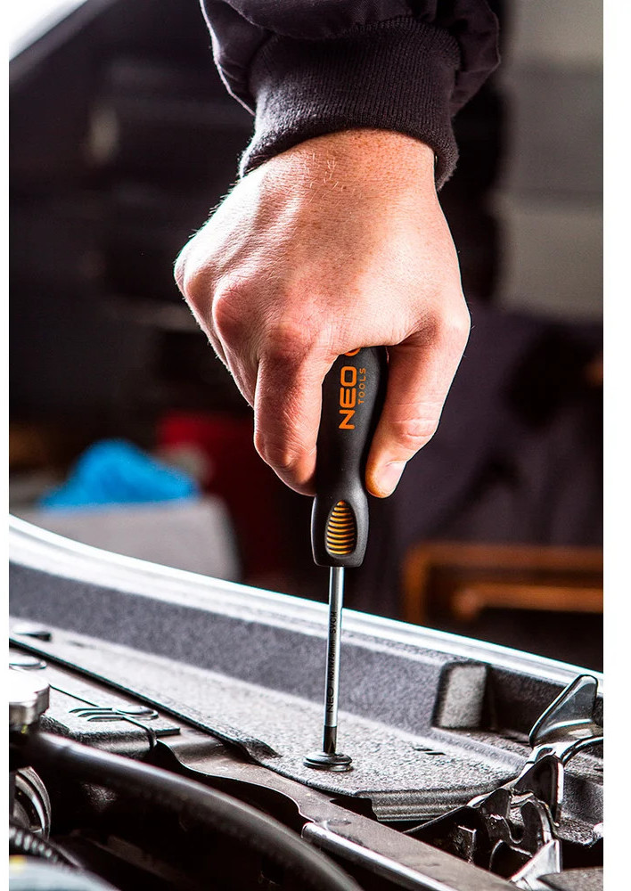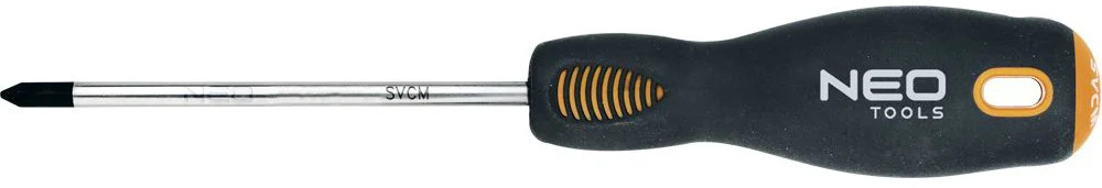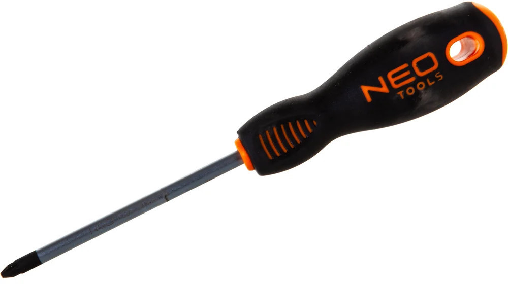 Крестовая отвертка NEO PZ2×100 мм S2 04-034 оснащена прочным и жестким стержнем из хромомолибдена. Рукоять надежно закреплена, что позволяет максимально передавать усилие от ладони на крепеж.