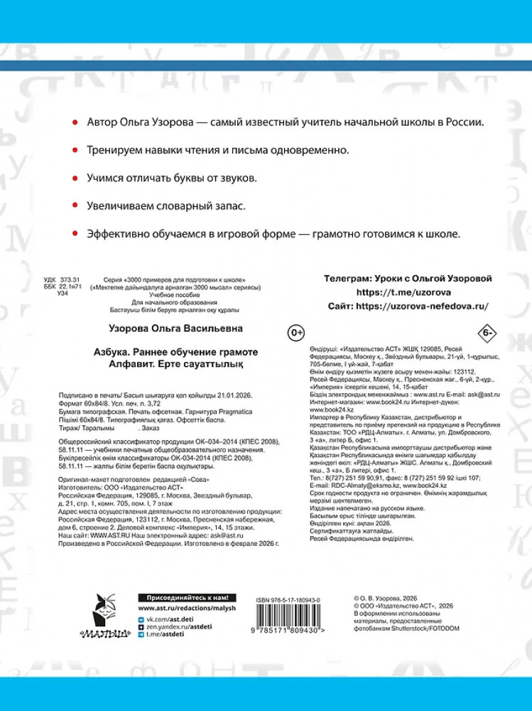 💳 Оплатить за товар можно при получении 🇰🇿 Есть бесплатная доставка по Казахстану от 1 дня 🎁 Копите бонусы с каждой покупки Серия: 3000 примеров для подготовки к школе «Азбука. Раннее обучение грамоте» — это незаменимый помощник для родителей, которые хотят, чтобы их дети быстро научились читать и писать. Благодаря уникальной авторской методике О. В. Узоровой ребята без труда выучат буквы от А до Я, потренируются их писать, научатся отличать буквы от звуков, пополнят словарный запас. Для дошкольного возраста. |