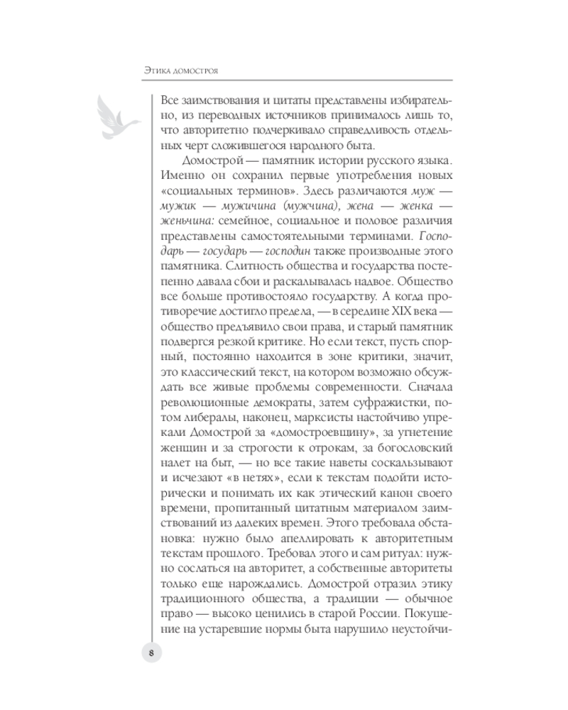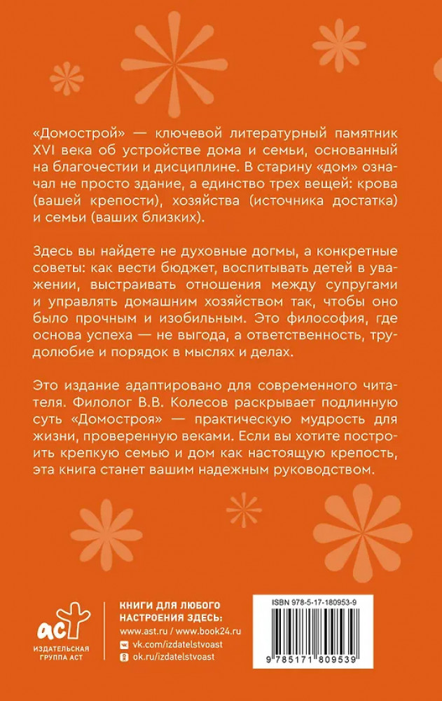 💳 Оплатить за товар можно при получении 🇰🇿 Есть бесплатная доставка по Казахстану от 1 дня 🎁 Копите бонусы с каждой покупки Серия: Семейные ценности «Домострой» – ключевой литературный памятник XVI столетия, представлявший собой обширный свод наставлений, определявший повседневный быт, духовные и социальные нормы. Его создание связывают с именем протопопа Сильвестра, духовника и сподвижника Ивана Грозного. В центре внимания устройство дома и семьи, основанное на благочестии, строгом порядке и дисциплине. Образ «дома» становится универсальным символом крепости веры, нравственной чистоты и незыблемости традиций. Труд отличается дидактичностью и глубокой религиозностью, что делает его ценным историческим источником для анализа культуры и мировоззрения на Руси. |