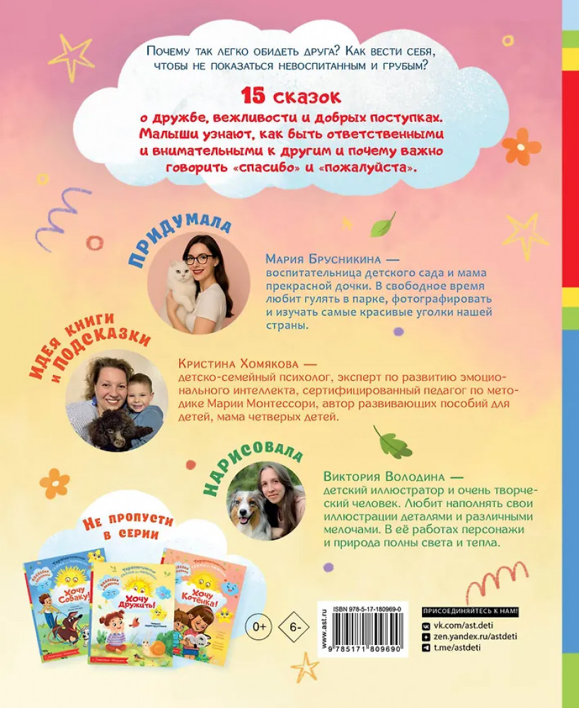 💳 Оплатить за товар можно при получении 🇰🇿 Есть бесплатная доставка по Казахстану от 1 дня 🎁 Копите бонусы с каждой покупки Серия: Терапевтические сказки для маленьких детей Почему так легко обидеть друга? Как вести себя, чтобы не показаться невоспитанным и грубым? 15 сказок о дружбе, вежливости и добрых поступках. Малыши узнают, как быть ответственными и внимательными к другим и почему важно говорить «спасибо» и «пожалуйста». |