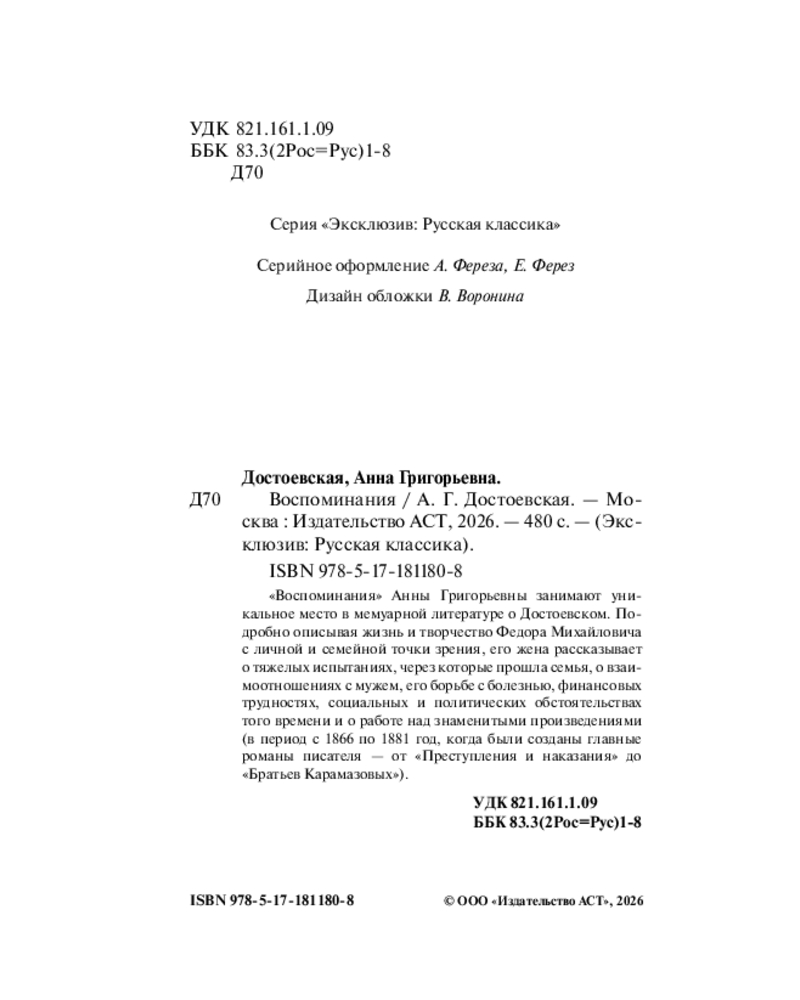 💳 Оплатить за товар можно при получении 🇰🇿 Есть бесплатная доставка по Казахстану от 1 дня 🎁 Копите бонусы с каждой покупки Серия: Эксклюзив: Русская классика «Воспоминания» Анны Григорьевны занимают уникальное место в мемуарной литературе о Достоевском. Подробно описывая жизнь и творчество Федора Михайловича с личной и семейной точки зрения, его жена рассказывает о тяжелых испытаниях, через которые прошла семья, о взаимоотношениях с мужем, его борьбе с болезнью, финансовых трудностях, социальных и политических обстоятельствах того времени и о работе над знаменитыми произведениями (в период с 1866 по 1881 год, когда были созданы главные романы писателя — от «Преступления и наказания» до «Братьев Карамазовых»). |