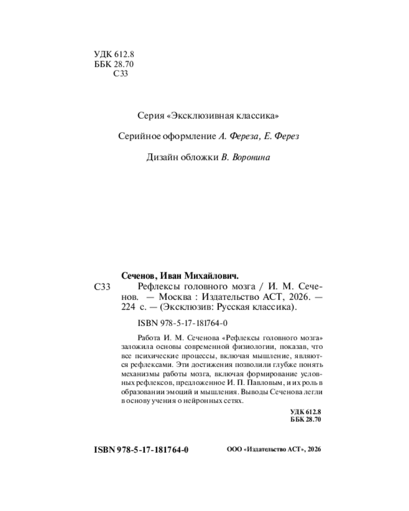 💳 Оплатить за товар можно при получении 🇰🇿 Есть бесплатная доставка по Казахстану от 1 дня 🎁 Копите бонусы с каждой покупки Серия: Эксклюзив: Русская классика Работа И. М. Сеченова «Рефлексы головного мозга» заложила основы современной физиологии, показав, что все психические процессы, включая мышление, являются рефлексами. Эти достижения позволили глубже понять механизмы работы мозга, включая формирование условных рефлексов, предложенное И. П. Павловым, и их роль в образовании эмоций и мышления. Выводы Сеченова легли в основу учения о нейронных сетях. |