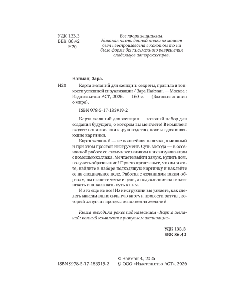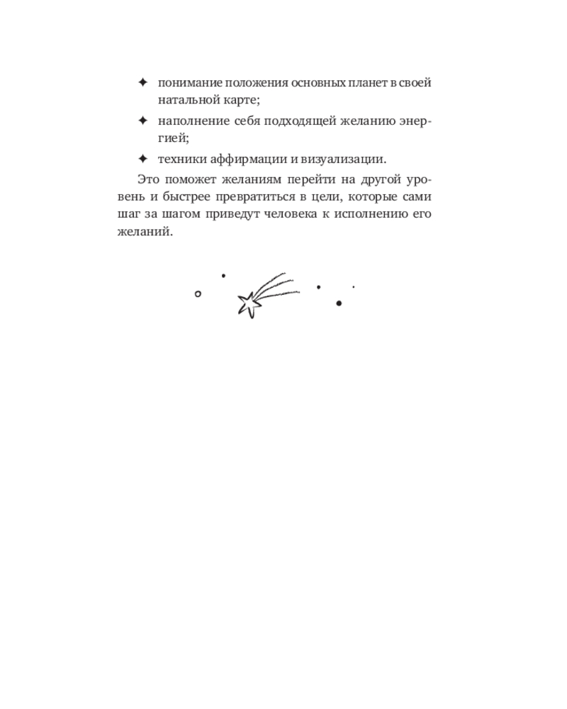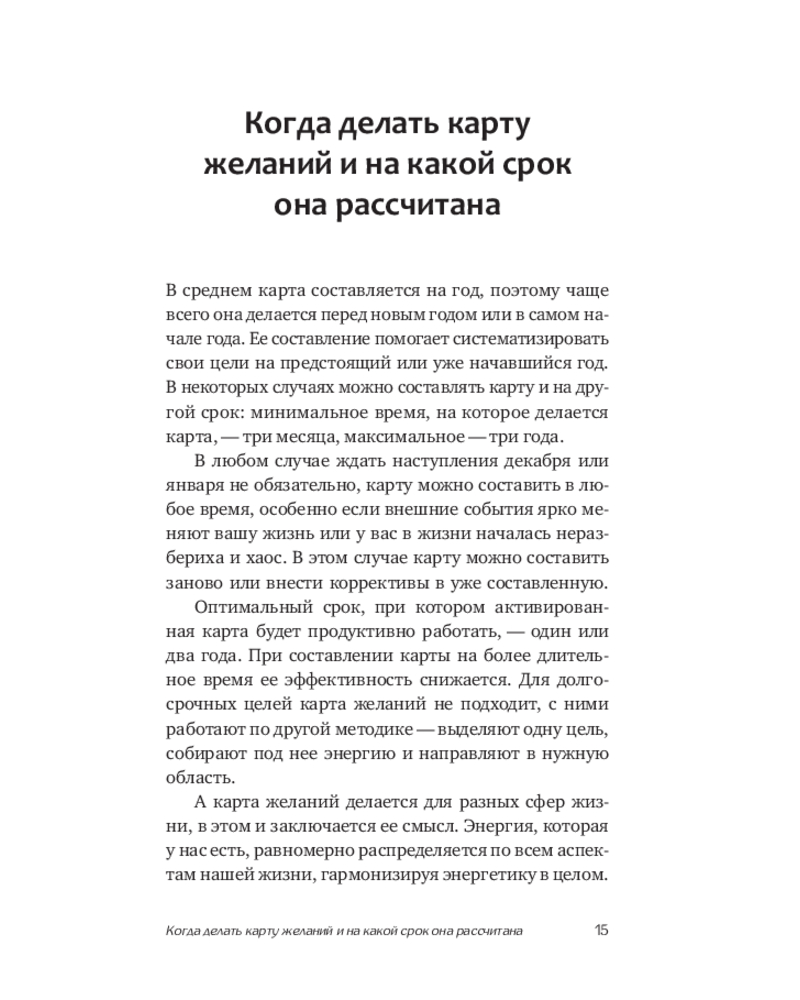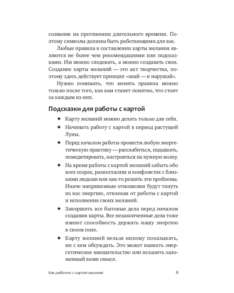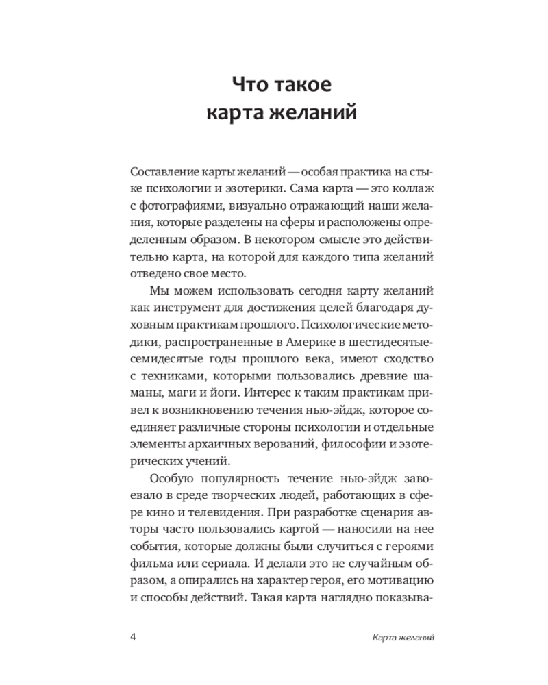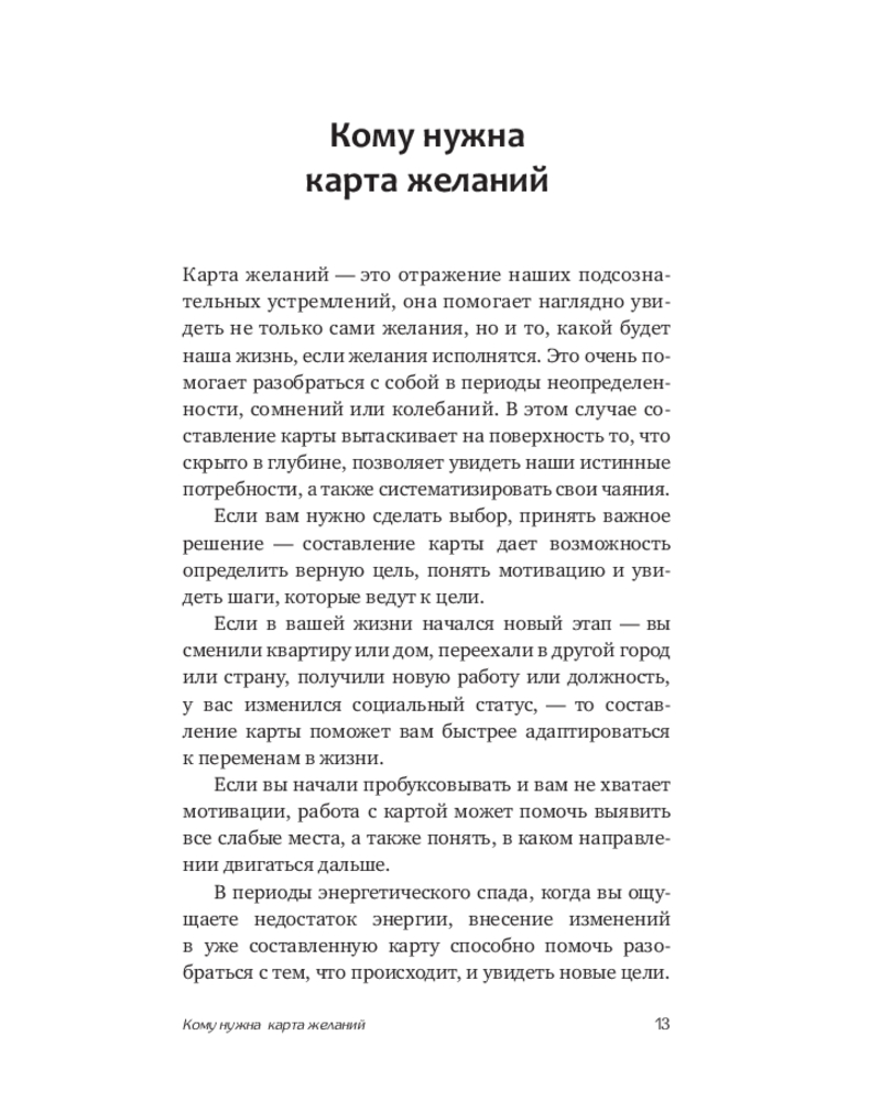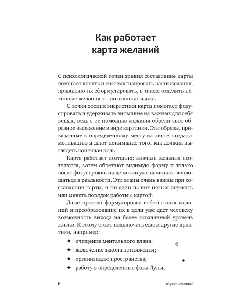 Даже если ты никогда раньше не создавала карту желаний — не переживай! Это пошаговое руководство подробно объяснит, как сделать ее осознанно, точно и без ошибок. Дополнительные практики по активации карты, работе с лунными циклами и аффирмациями ускорят движение к успеху. Карта желаний не предсказывает будущее — она помогает его создавать. Начни жить так, как всегда мечтала! Книга выходила ранее под названием «Карта желаний: полный комплект с ритуалом активации». |
