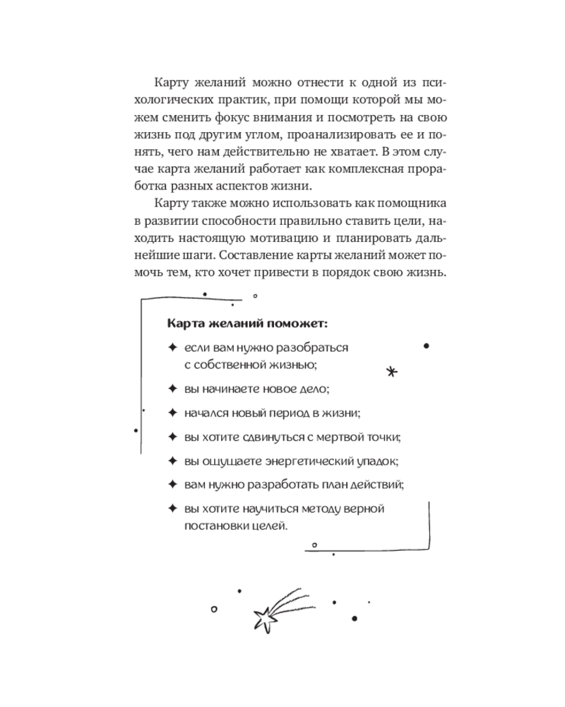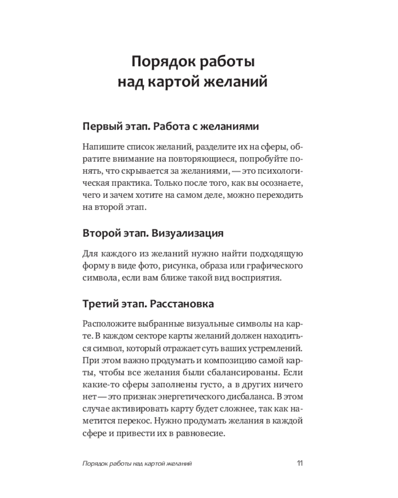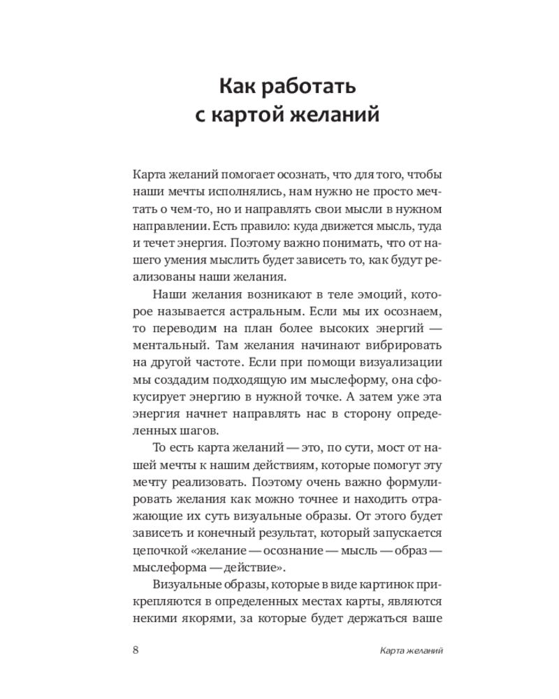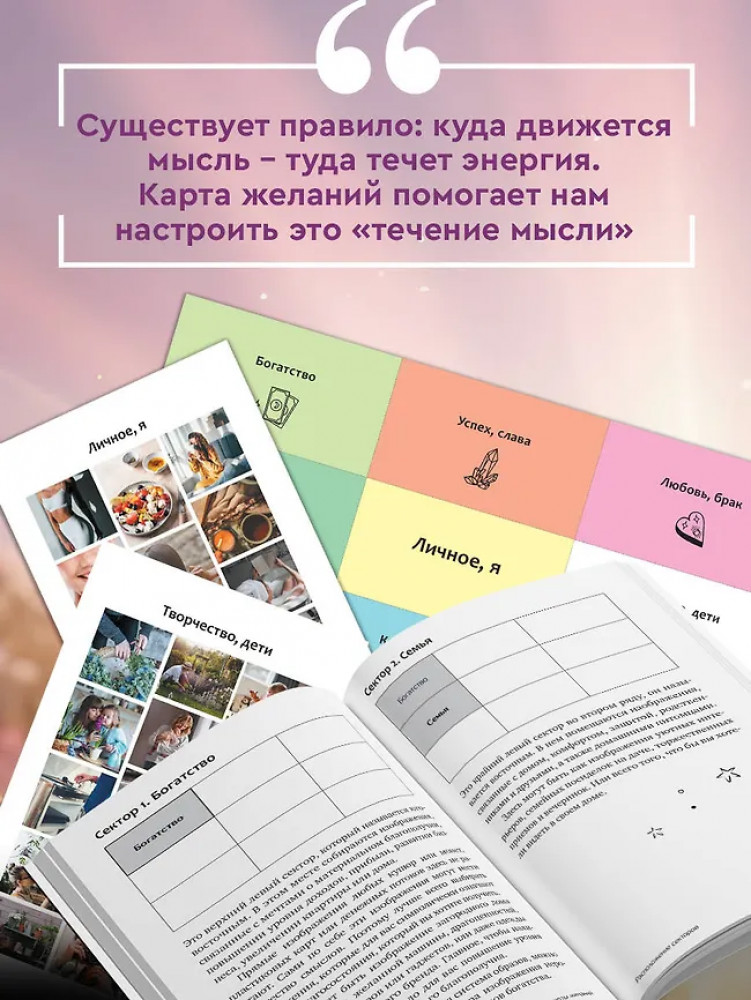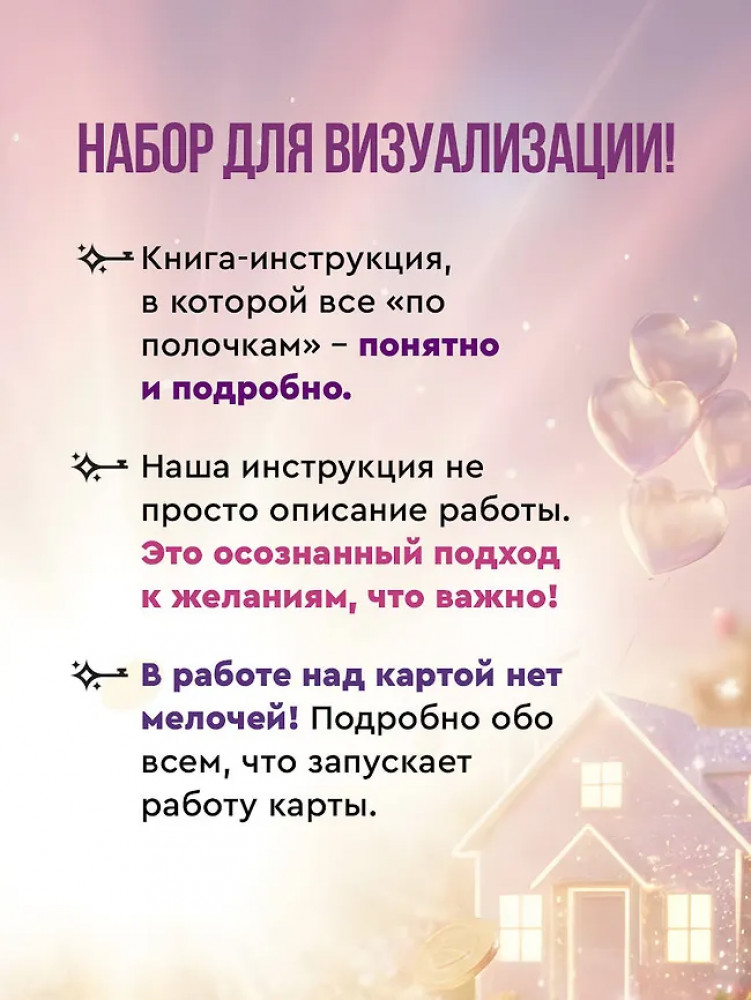 • полный комплект для создания карты желаний: книга-инструкция, поле-основа для будущей карты, картинки для успешной визуализации;