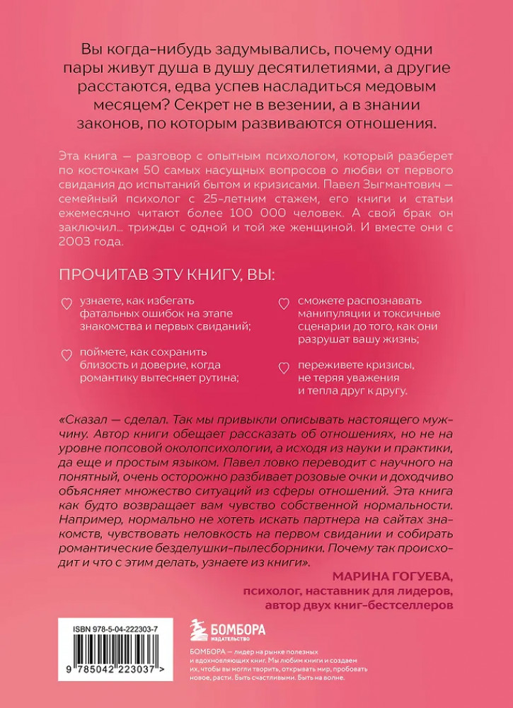 💳 Оплатить за товар можно при получении 🇰🇿 Есть бесплатная доставка по Казахстану от 1 дня 🎁 Копите бонусы с каждой покупки Серия: Психология влияния Вы когда-нибудь задумывались, почему одни пары живут душа в душу десятилетиями, а другие расстаются, едва успев насладиться медовым месяцем? Секрет не в везении, а в знании законов, по которым развиваются отношения. Эта книга — разговор с опытным психологом, который разберет по косточкам 50 самых насущных вопросов о любви. От первого свидания до испытаний бытом и кризисами. Павел Зыгмантович — семейный психолог с 25-летним стажем, его книги и статьи ежемесячно читают более 100 000 человек. А свой брак он заключил... трижды с одной и той же женщиной. И вместе они с 2003 года. |