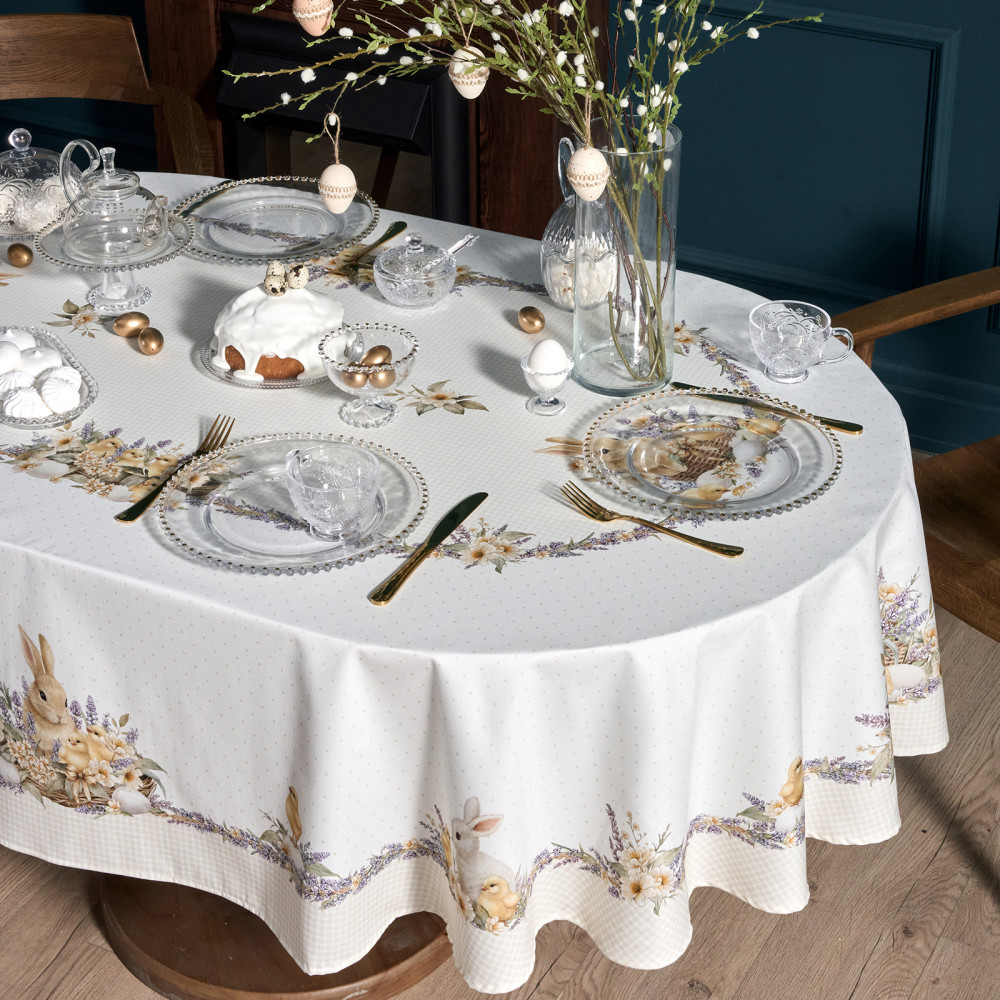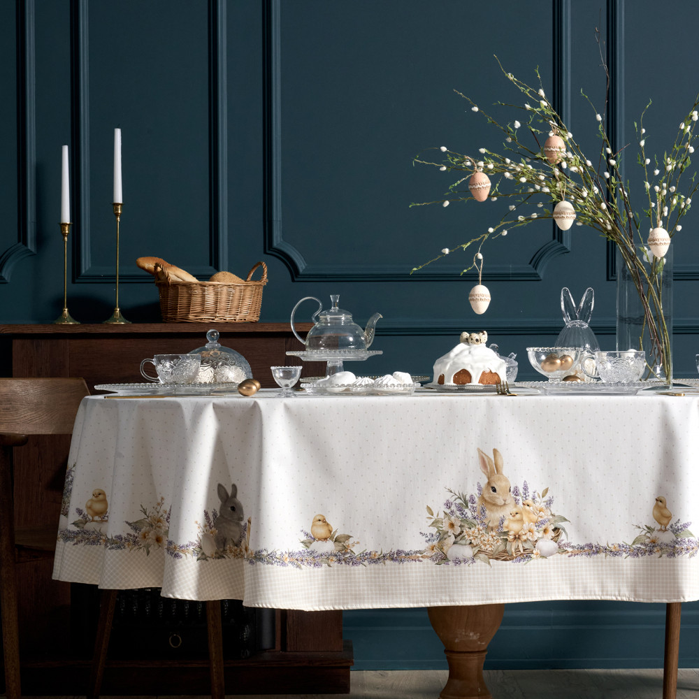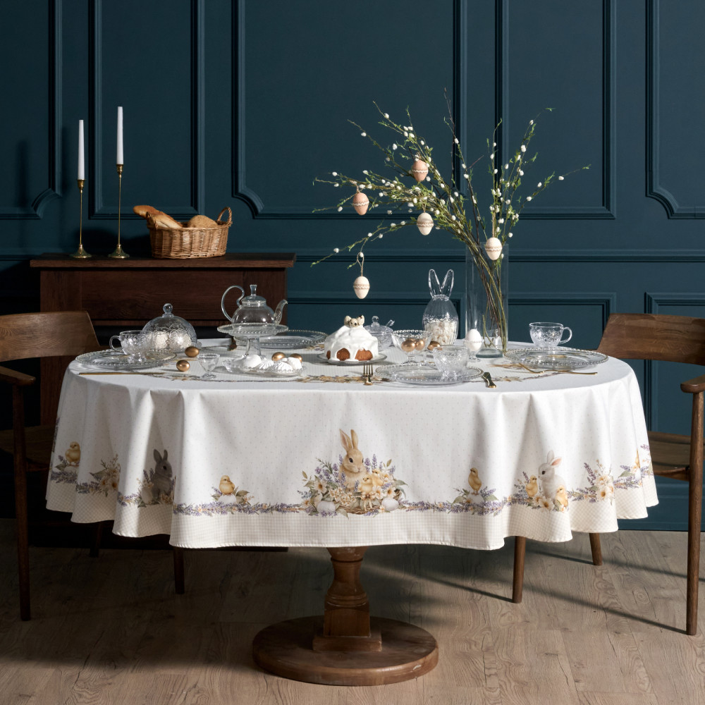 Принт с милыми кроликами, нежными оттенками и природными мотивами делает изделие выразительным элементом декора, благодаря которому стол становится центром внимания. Он создаёт атмосферу уюта и гармонии на кухне, даче или в гостиной. Стильная скатерть легко сочетается с посудой и аксессуарами из этой же серии, позволяя оформить сервировку в едином стиле. Может стать отличным подарком на Пасху для мамы, бабушки, подруги или близкого человека, который ценит уют и красивый домашний текстиль.