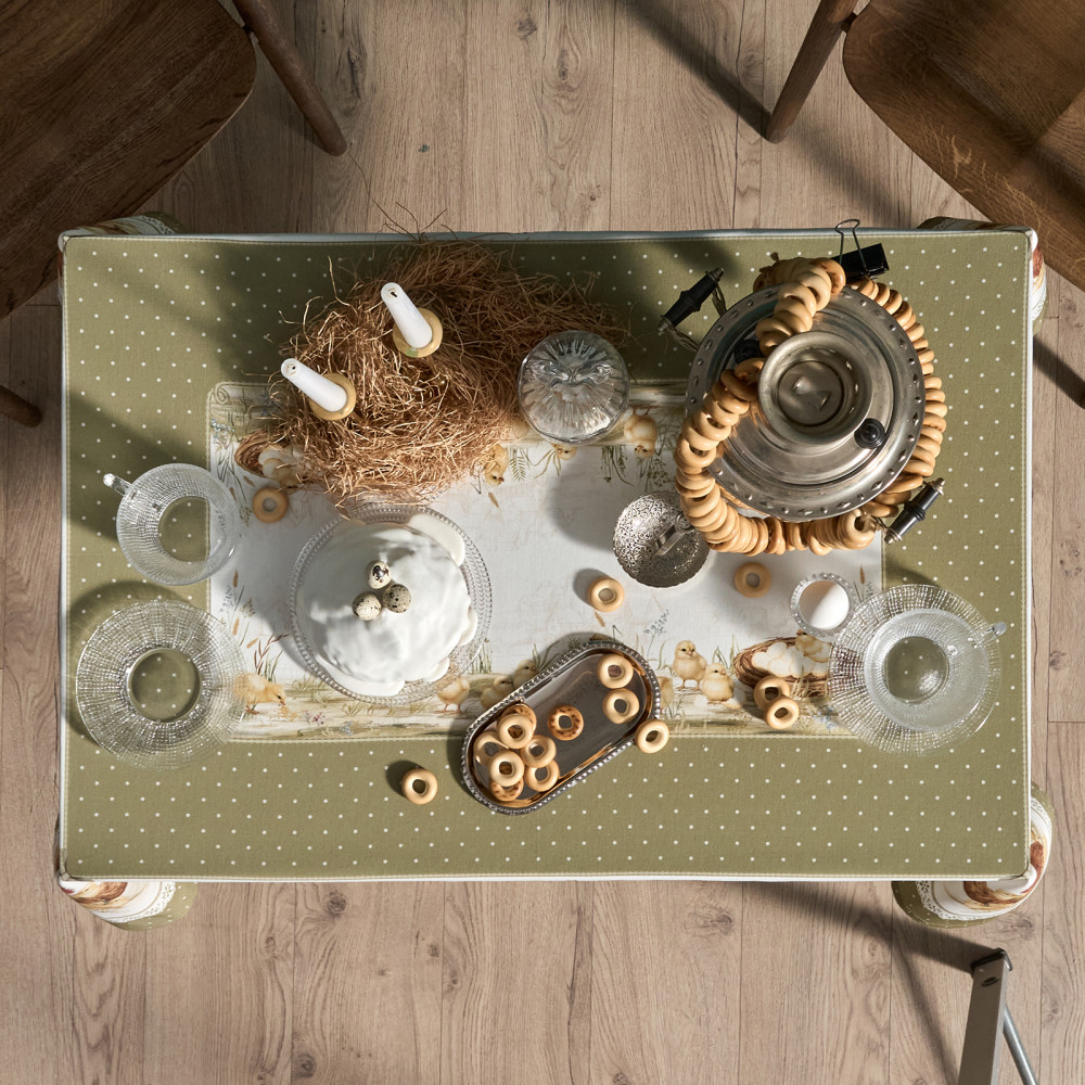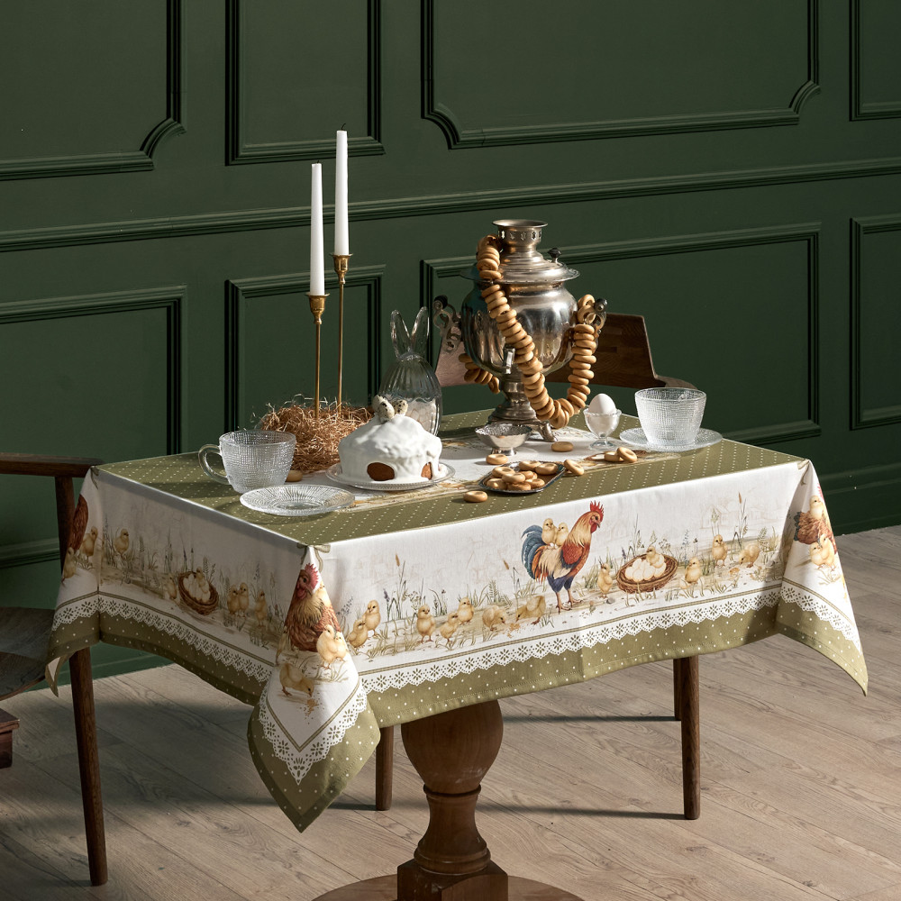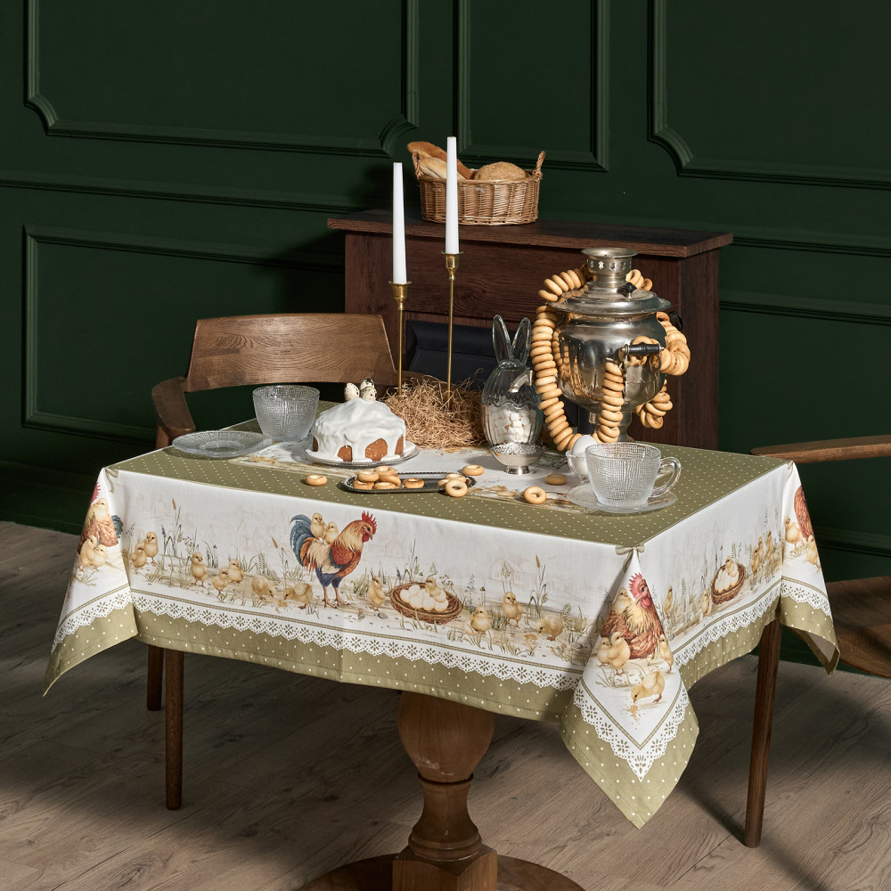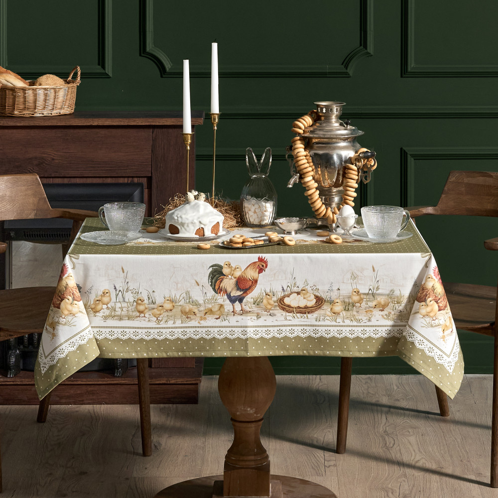 Принт с петушком, курочками и цыплятами в мягких зеленых оттенках придаёт скатерти атмосферу праздника Пасхи и весеннего уюта. Деревенский мотив делает её выразительным элементом декора, благодаря которому стол становится центром внимания и гармоничным акцентом кухни, гостиной или дачи. Стильная прямоугольная скатерть может стать отличным подарком на Пасху или Новоселье для мамы, бабушки, подруги или близкого человека, который ценит уют и красивый домашний текстиль. Произведена в России. Качественная обработка края и прочная ткань обеспечивают долговечность и безупречный внешний вид изделия.