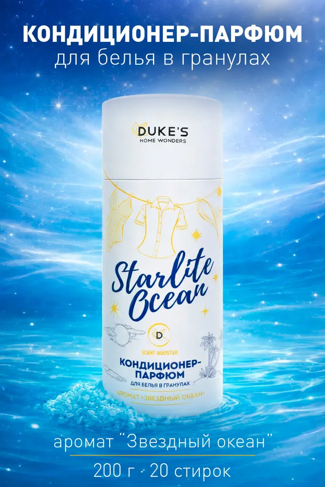 Парфюм для белья гранулы помогут вам не только сохранить свежесть вещей, но и создать атмосферу уюта и тепла в вашем доме. Аромат «Звездный океан» будет радовать вас и ваших близких каждый раз, когда вы будете разбирать стирку. Благодаря приятному аромату и качественному уходу за тканями, кондиционеры в гранулах становятся обязательным атрибутом любой стирки. Мы рекомендуем именно этот продукт тем, кто ценит домашний комфорт и хочет, чтобы его вещи пахли свежестью и чистотой. Придайте своему белью великолепный аромат и мягкость с кондиционером-парфюмом для белья в гранулах DUKE’S.