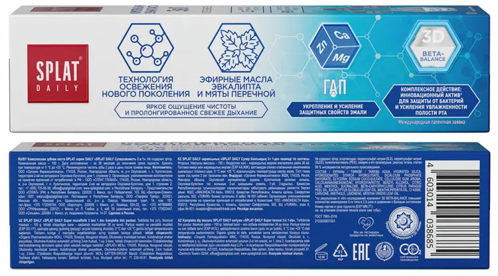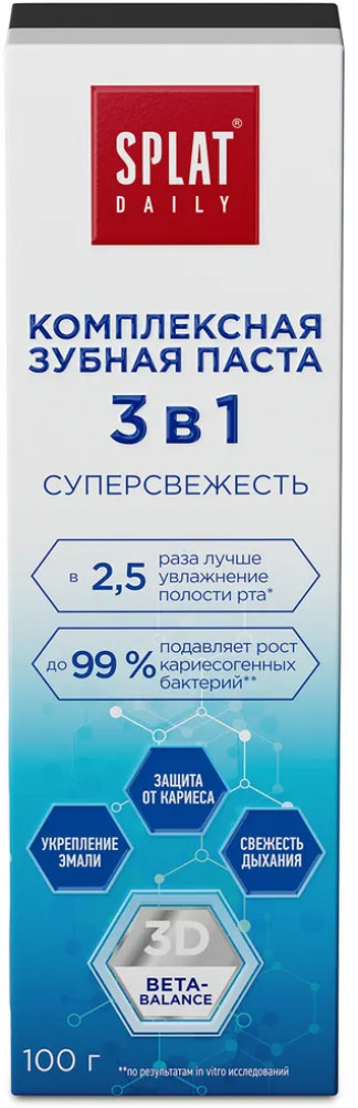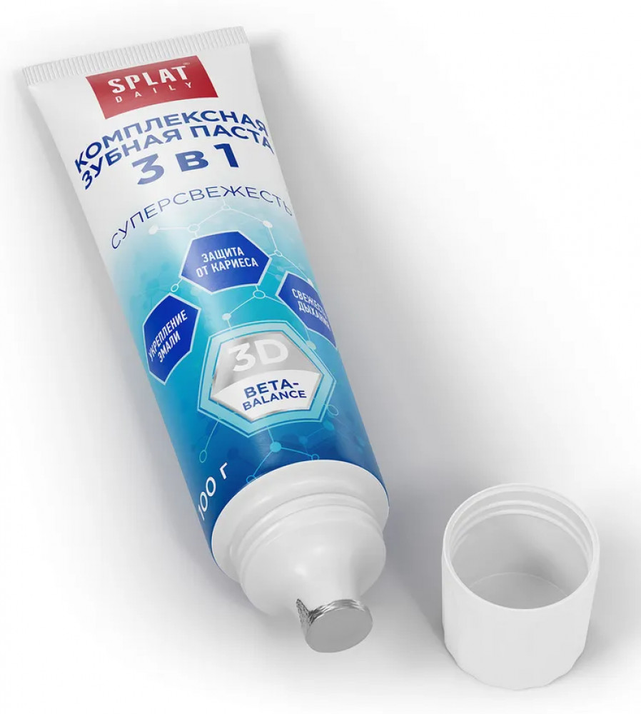Зубная паста для свежего дыхания Splat Daily «Суперсвежесть 3в1» разработана с учётом комфорта в течение дня. Зубная паста для эмали помогает нейтрализовать неприятные запахи, поддерживать ощущение чистоты и уверенности после чистки зубов и между приёмами пищи. Отдельное преимущество формулы — компонент 3D BETA-BALANCE, который, по результатам in vitro исследований, повышает количество аквапоринов 5-го типа в 2,5 раза по сравнению с базовым состоянием. Это способствует улучшенному увлажнению полости рта, снижает ощущение сухости и повышает общий комфорт после чистки зубов.