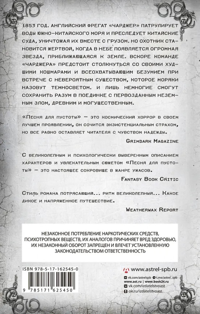 💳 Оплатить за товар можно при получении 🇰🇿 Есть бесплатная доставка по Казахстану от 1 дня 🎁 Копите бонусы с каждой покупки Серия: Мастера ужасов 1853 год. Английский фрегат «Чарджер» патрулирует воды Южно-Китайского моря и преследует китайские суда, уничтожая их вместе с грузом. Но охотник становится жертвой, когда в небе появляется огромная звезда, приближающаяся к Земле. Вскоре команде «Чарджера» предстоит столкнуться со своими худшими кошмарами и всеохватывающим безумием при встрече с невероятным существом, которое моряки назовут Темносветом. И лишь немногие смогут сохранить разум в поединке с первозданным неземным злом, древним и могущественным. |