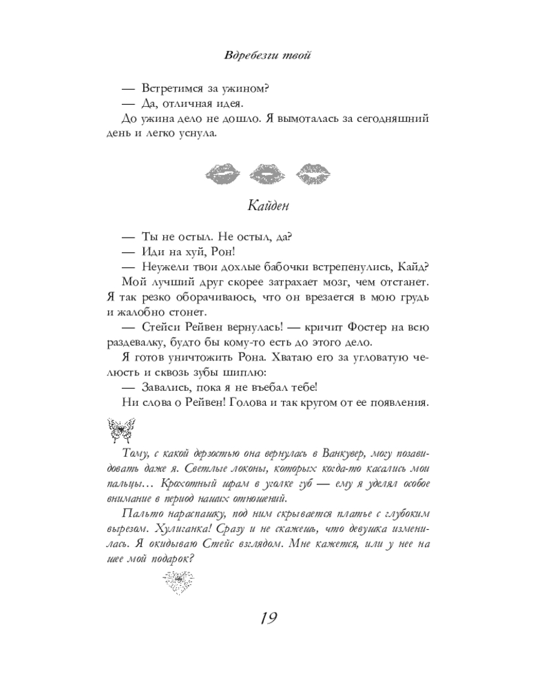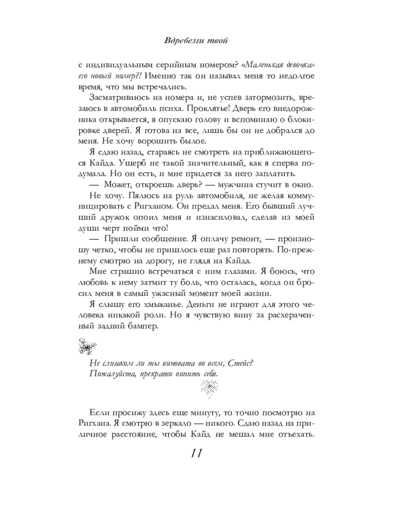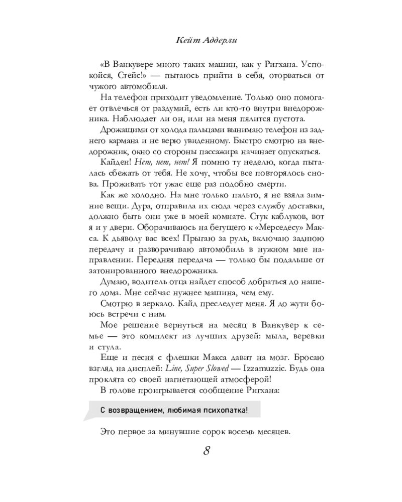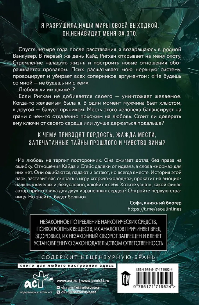 💳 Оплатить за товар можно при получении 🇰🇿 Есть бесплатная доставка по Казахстану от 1 дня 🎁 Копите бонусы с каждой покупки Серия: Оттенки чувств Я разрушила наши миры своей выходкой. Он ненавидит меня за это. Спустя четыре года после расставания я возвращаюсь в родной Ванкувер. В первый же день Кайд Рихган открывает на меня охоту. Стремление наладить жизнь и построить новые отношения оборачивается провалом. Псих расшатывает мою нервную систему, провоцирует и убирает всех соперников аргументом: «Не будешь со мной — не будешь ни с кем». |