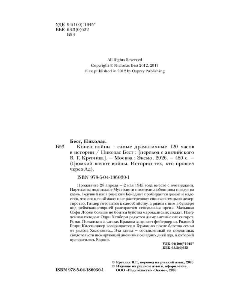 💳 Оплатить за товар можно при получении 🇰🇿 Есть бесплатная доставка по Казахстану от 1 дня 🎁 Копите бонусы с каждой покупки Серия: Громкий шепот войны. Истории тех, кто прошел через Ад Проживите 28 апреля — 2 мая 1945 года вместе с очевидцами. Партизаны поднимают Муссолини с постели любовницы и ведут на казнь. Будущий папа римский Бенедикт пробирается домой и надеется, что его не поймают и не расстреляют свои же немцы за дезертирство. Гитлер готовится к самоубийству, а рядом с ним в бункере под рейхсканцелярией разгорается сексуальная оргия. |