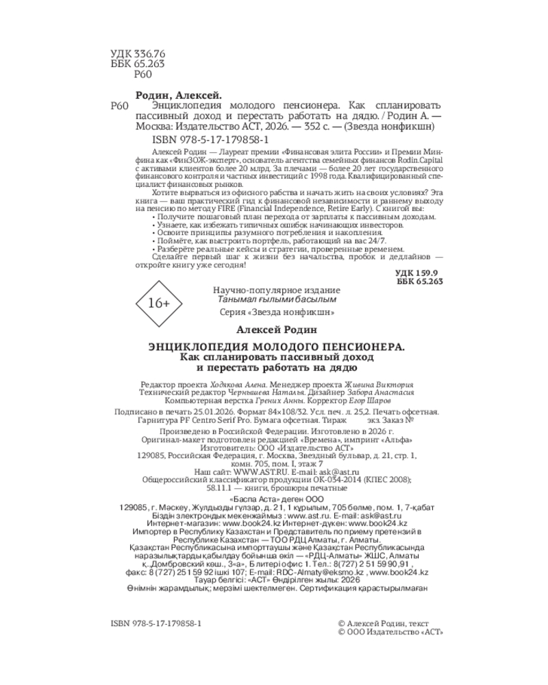 💳 Оплатить за товар можно при получении 🇰🇿 Есть бесплатная доставка по Казахстану от 1 дня 🎁 Копите бонусы с каждой покупки Серия: Звезда нонфикшн Алексей Родин — лауреат премии «Финансовая элита России» и Премии Минфина как «ФинЗОЖ-эксперт», основатель агентства семейных финансов Rodin.Capital с активами клиентов более 20 млрд. За плечами — более 20 лет государственного финансового контроля и частных инвестиций с 1998 года. Квалифицированный специалист финансовых рынков. |