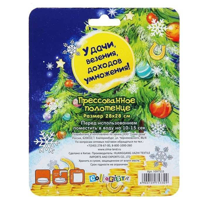 Collorista Прессованное полотенце на открытке «Удачи в Новом году!» (28х28 см)В данный момент этот товар отсутствует в продаже. Возможно, у нас найдется аналогичный или похожий товар здесь. Прессованное полотенце на открытке "Collorista" станет полезным и оригинальным дополнением к подарку на Новый год. Уникальное дизайнерское оформление в виде открытки продемонстрирует вашу заботу и любовь. Изделие выполнено из натурального хлопка, что позволяет ему хорошо впитывать влагу и удерживать пыль или грязь на своей ворсистой поверхности. Полотенце перед использованием нужно подержать в воде, затем высушить. Оно пригодится в дальней дороге или путешествии, а компактный размер позволит взять его с собой куда угодно. |
