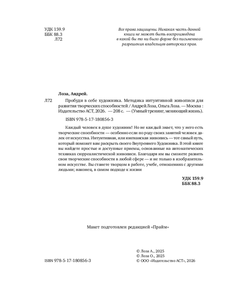 💳 Оплатить за товар можно при получении 🇰🇿 Есть бесплатная доставка по Казахстану от 1 дня 🎁 Копите бонусы с каждой покупки Серия: Умный тренинг, меняющий жизнь Творчество — неотъемлемая часть человеческой природы. Оно способно сделать человека счастливым, а его жизнь — яркой и полной удивительных открытий. Методика интуитивной живописи поможет вам разбудить вашего Внутреннего Художника и развить творческие способности в любой сфере — от работы и обучения до отношений с людьми. С помощью этой книги вы освоите приемы и техники, которые дадут вам возможность творить свободно и смело, без оглядки на перфекционизм и мнение окружающих. Вы не только узнаете, как развить воображение, творческое видение и ассоциативное мышление, но и реализуете свой потенциал, станете творцом во всем, от живописи до самого подхода к жизни, познакомитесь с собой настоящим и исцелите свои душевные раны! |
