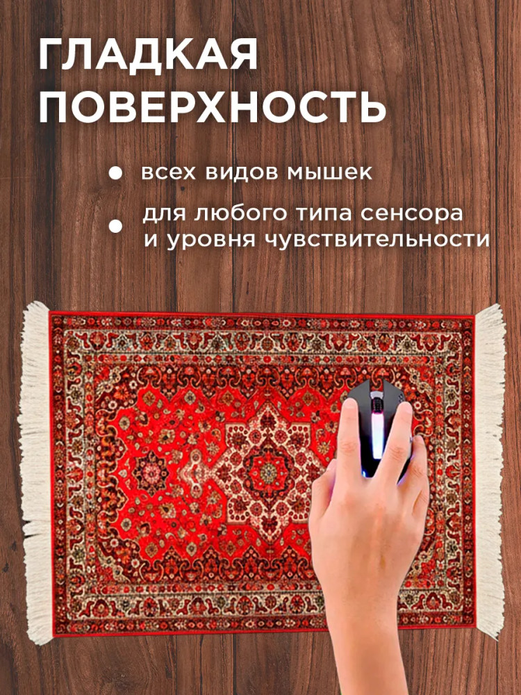 Легендарный ковёр теперь на вашем рабочем столе! Добавьте уюта и кастомного стиля вашему рабочему месту с ковриком в эстетике СССР. Этот необычный аксессуар с детализированным восточным принтом не только радует глаз, но и обеспечивает максимальный комфорт при работе за компьютером или ноутбуком.