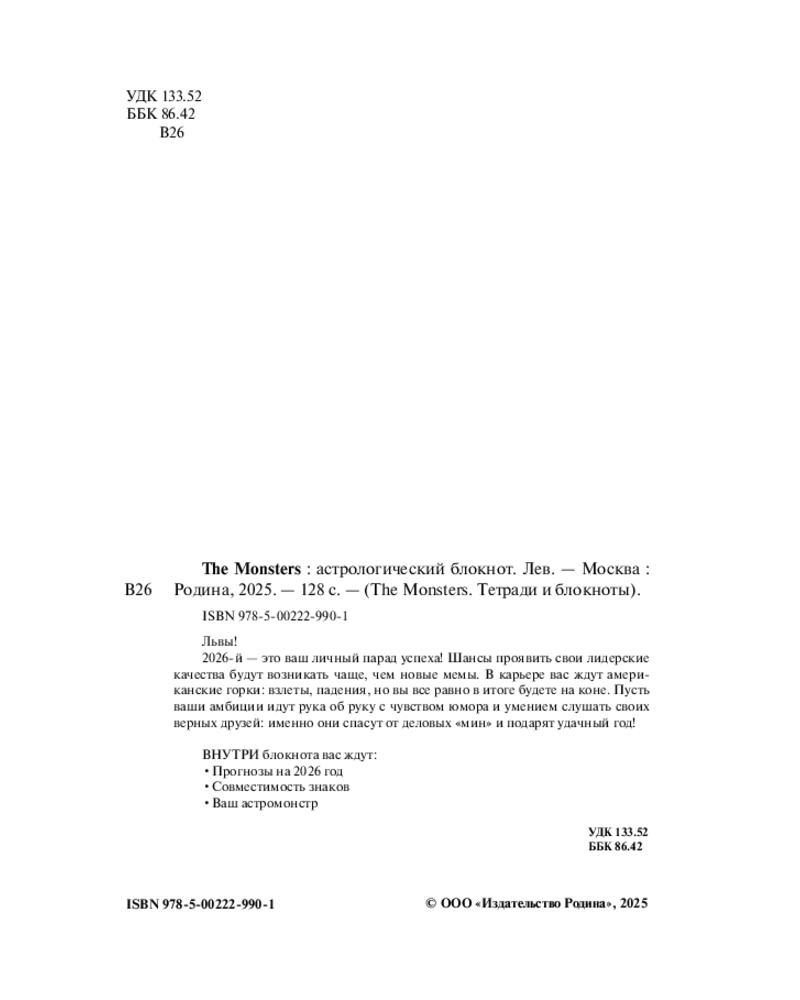 💳 Оплатить за товар можно при получении 🇰🇿 Есть бесплатная доставка по Казахстану от 1 дня 🎁 Копите бонусы с каждой покупки Серия: The Monsters. Тетради и блокноты Львы! 2026-й — это ваш личный парад успеха! Шансы проявить свои лидерские качества будут возникать чаще, чем новые мемы. В карьере вас ждут американские горки: взлеты, падения, но вы все равно в итоге будете на коне. Пусть ваши амбиции идут рука об руку с чувством юмора и умением слушать своих верных друзей: именно они спасут от деловых «мин» и подарят удачный год! |