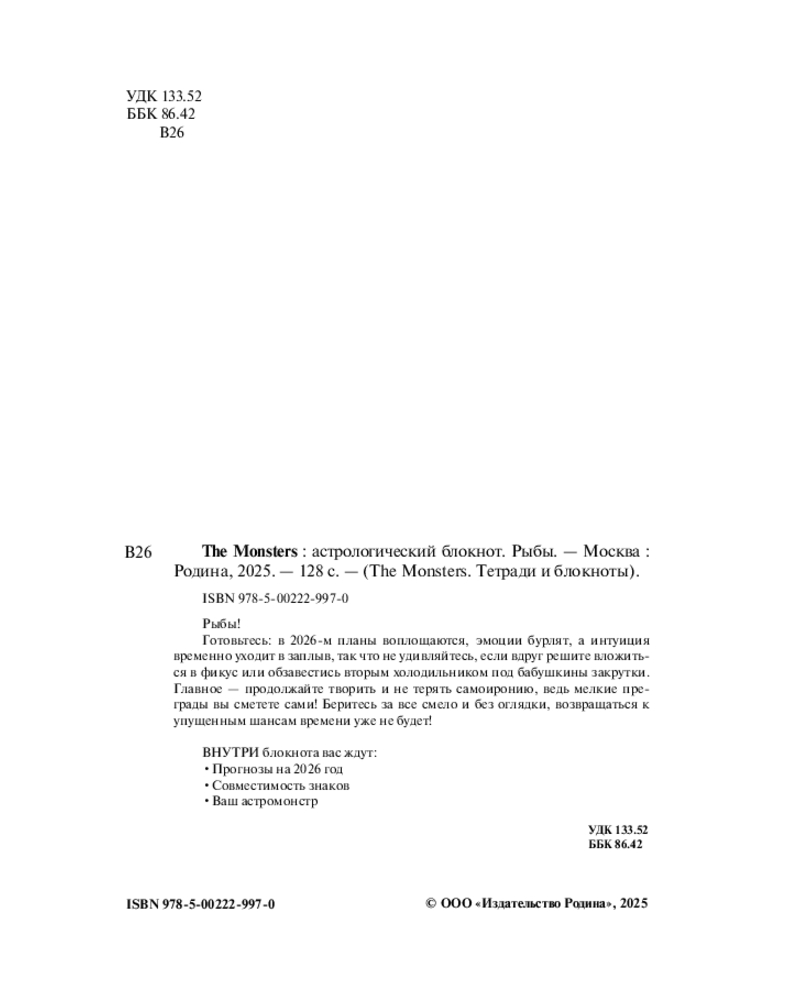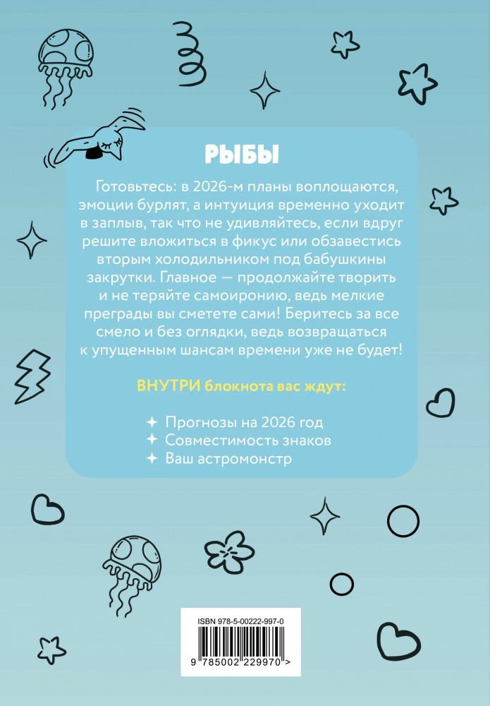 💳 Оплатить за товар можно при получении 🇰🇿 Есть бесплатная доставка по Казахстану от 1 дня 🎁 Копите бонусы с каждой покупки Серия: The Monsters. Тетради и блокноты Рыбы! Готовьтесь: в 2026-м планы воплощаются, эмоции бурлят, а интуиция временно уходит в заплыв, так что не удивляйтесь, если вдруг решите вложиться в фикус или обзавестись вторым холодильником под бабушкины закрутки. Главное — продолжайте творить и не терять самоиронию, ведь мелкие преграды вы сметёте сами! Беритесь за все смело и без оглядки, ведь возвращаться к упущенным шансам времени уже не будет! |