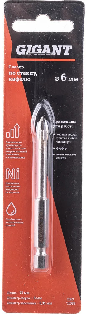 Сверло Gigant DBG 11089 предназначено для получения отверстий в изделиях из стекла и керамики с помощью дрели. Рабочая часть сверла имеет 4 грани. Рекомендуется использовать охлаждающую жидкость при работе сверлом для более качественного сверления и долгой службы. Длина сверла составляет 75 мм, диаметр — 6 мм. Данный товар поставляется взамен модели: Сверло по стеклу/кафелю (6 мм) Inforce 11-01-089. Копьевидное сверло позволяет аккуратно сверлить хрупкие материалы. Твердосплавная пластина в наконечнике увеличивает производительность. Никелевое напыление — для защиты наконечника от коррозии. Внимание! Накладки сверл чувствительны к перегреву, рекомендуется охлаждать наконечник или делать перерывы в работе.