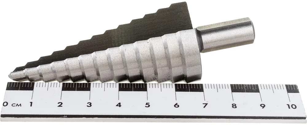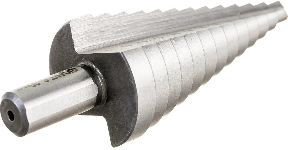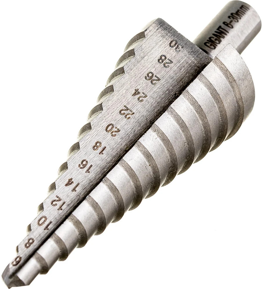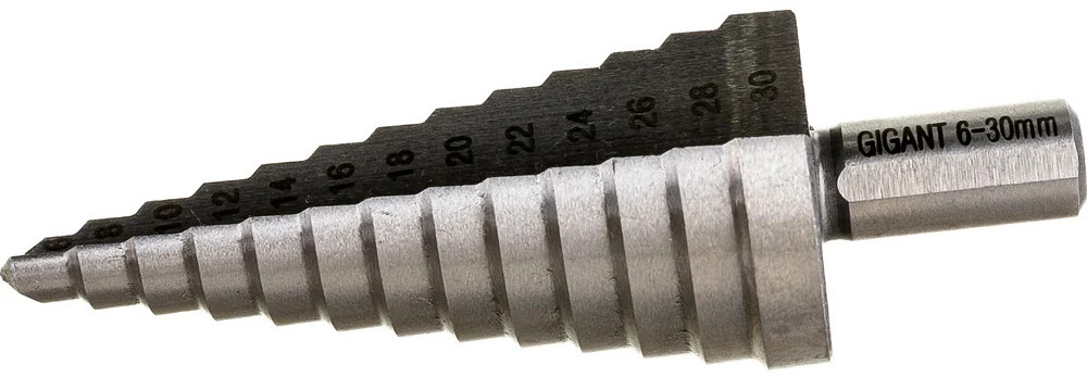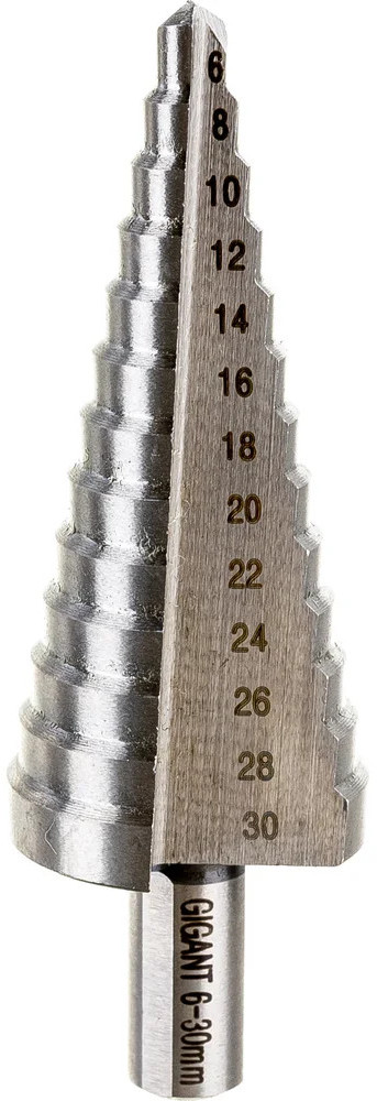 Сверло ступенчатое Gigant GSD 11055 предназначено для получения отверстий различного диаметра без перестановки режущего инструмента. Количество ступеней — 13 штук. Диаметр ступеней — 6-8-10-12-14-16-18-20-22-24-26-28-30 мм. На каждой ступени есть маркировка фактического диаметра. Сверло изготовлено из быстрорежущей стали HSS. Трёхгранный хвостовик предотвращает проворачивание оснастки в патроне инструмента.