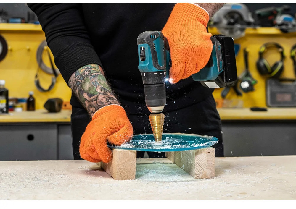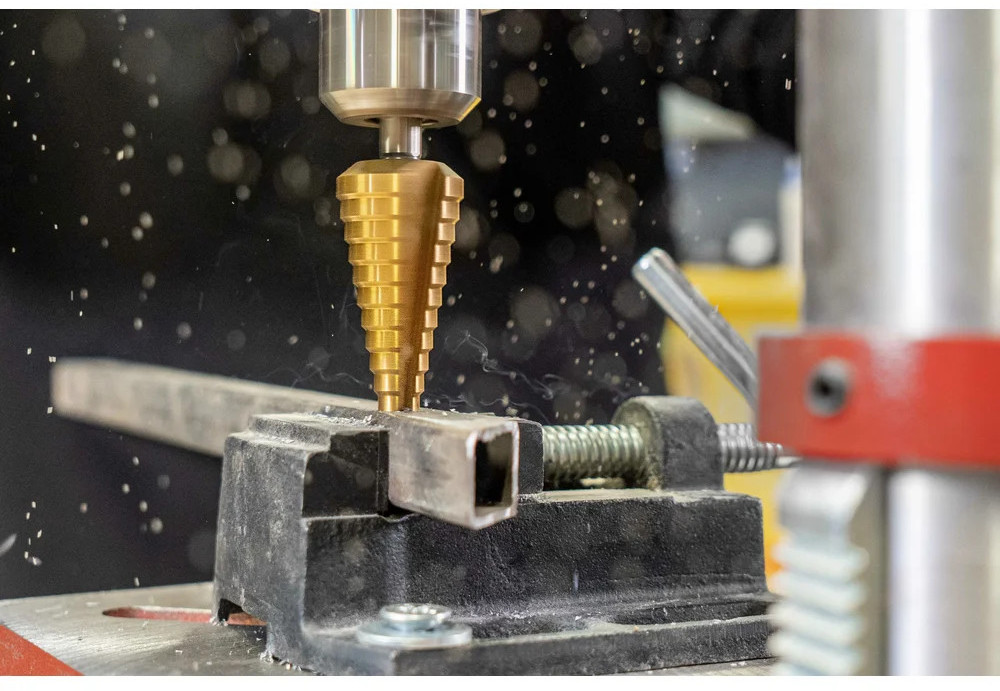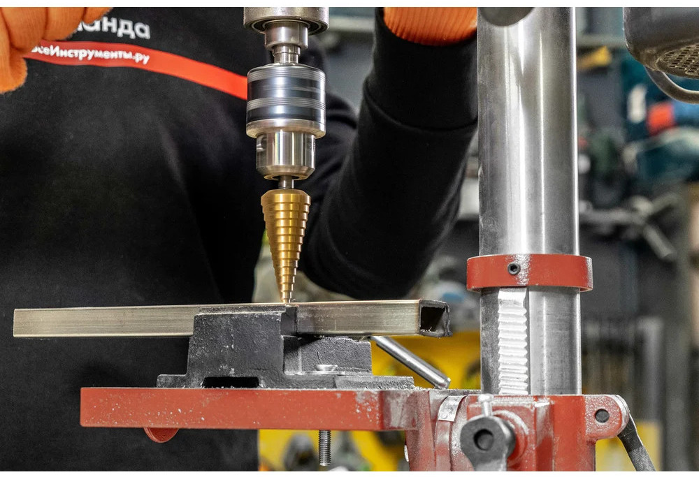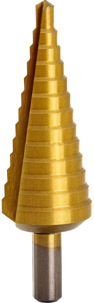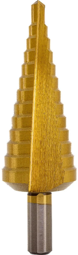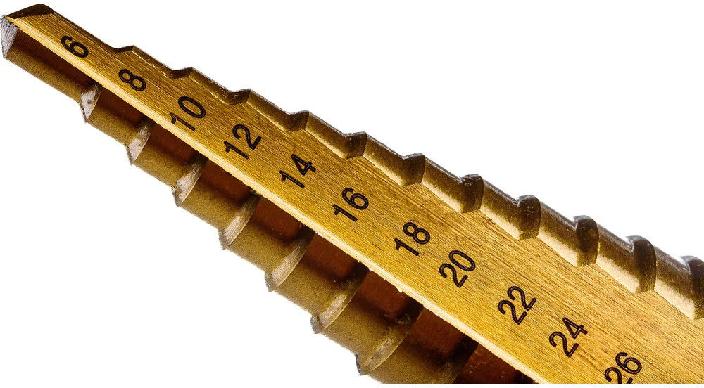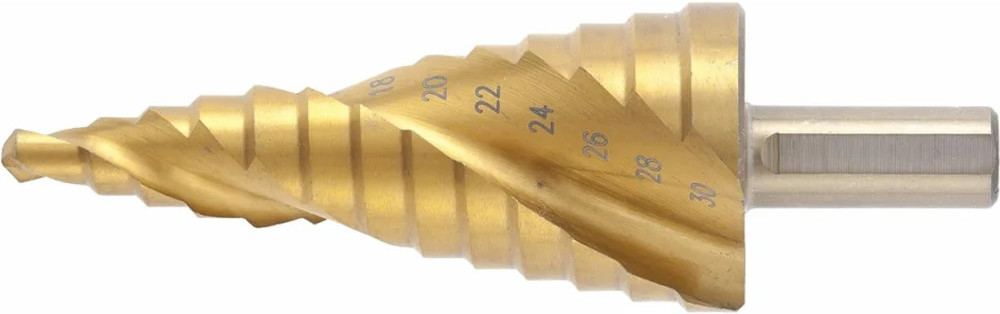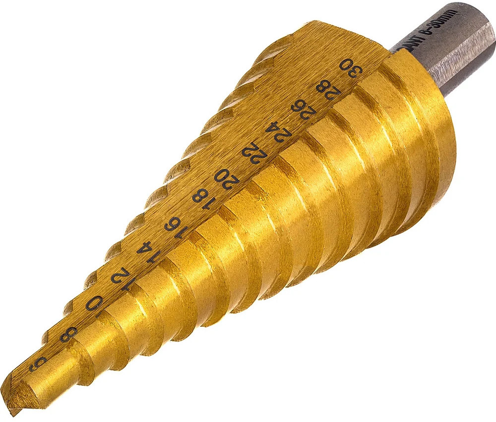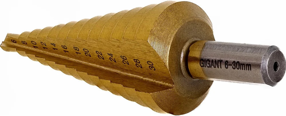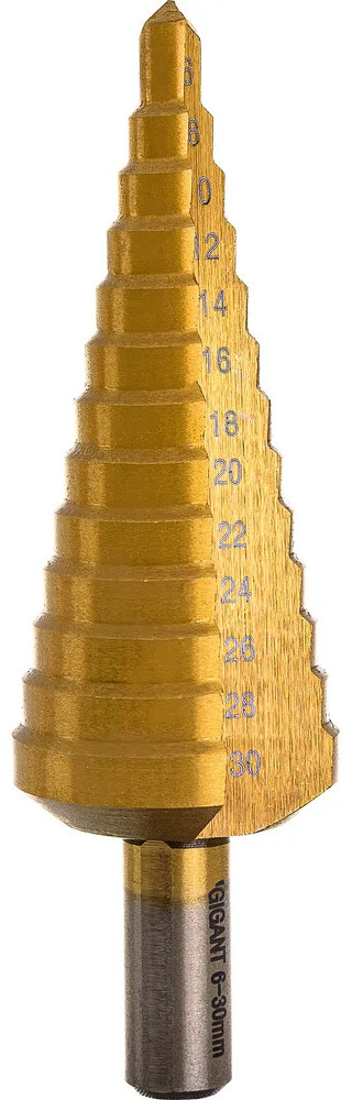 Сверло ступенчатое 6-30 мм, HSS-TIN Gigant GT-161 предназначено для сверления отверстий разных диаметров в листовых и тонкостенных изделиях из стали до 4 мм, цветных металлов, нержавеющей стали и пластика. 13 ступеней: 6 мм, 8 мм, 10 мм, 12 мм, 14 мм, 16 мм, 18 мм, 20 мм, 22 мм, 24 мм, 26 мм, 28 мм, 30 мм. Каждый следующий размер имеет плавный переход в виде ступеньки, что позволяет получать аккуратное отверстие нужного диаметра. Сверло имеет нитрид-титановое покрытие. По сравнению с обычными сверлами из быстрорежущей стали скорость сверления у титановых выше на 50%. Трёхгранный хвостовик предотвращает проворачивание оснастки в патроне инструмента.