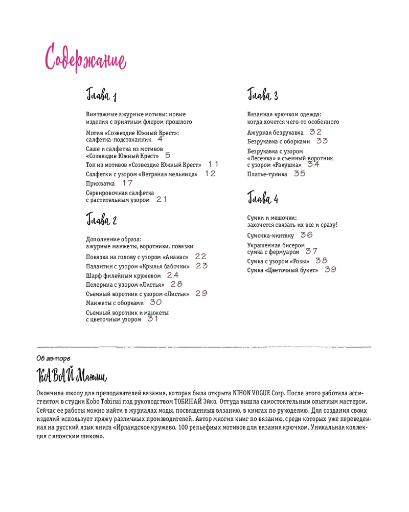 Серия: Звезды рукоделия. Бестселлер из Японии Хотите создавать вещи, полные шарма и изящества, но кажется, что кружево — это слишком сложно? Забудьте! Перед вами — революционный подход от японского мастера Маюми Каваи. Ее философия — утонченная простота, доступная каждой. Знаменитая японская художница представляет уникальную авторскую коллекцию — 30 изделий для вязания крючком и полный базовый курс по созданию кружевных узоров. Новичок или мастер, каждый найдет для себя важное и интересное. Если вы начинающий, вы постигнете искусство вязаного кружева с нуля. Если опытная вязальщица — книга подарит наслаждение японской утонченностью, новыми нетривиальными идеями и морем вдохновения!