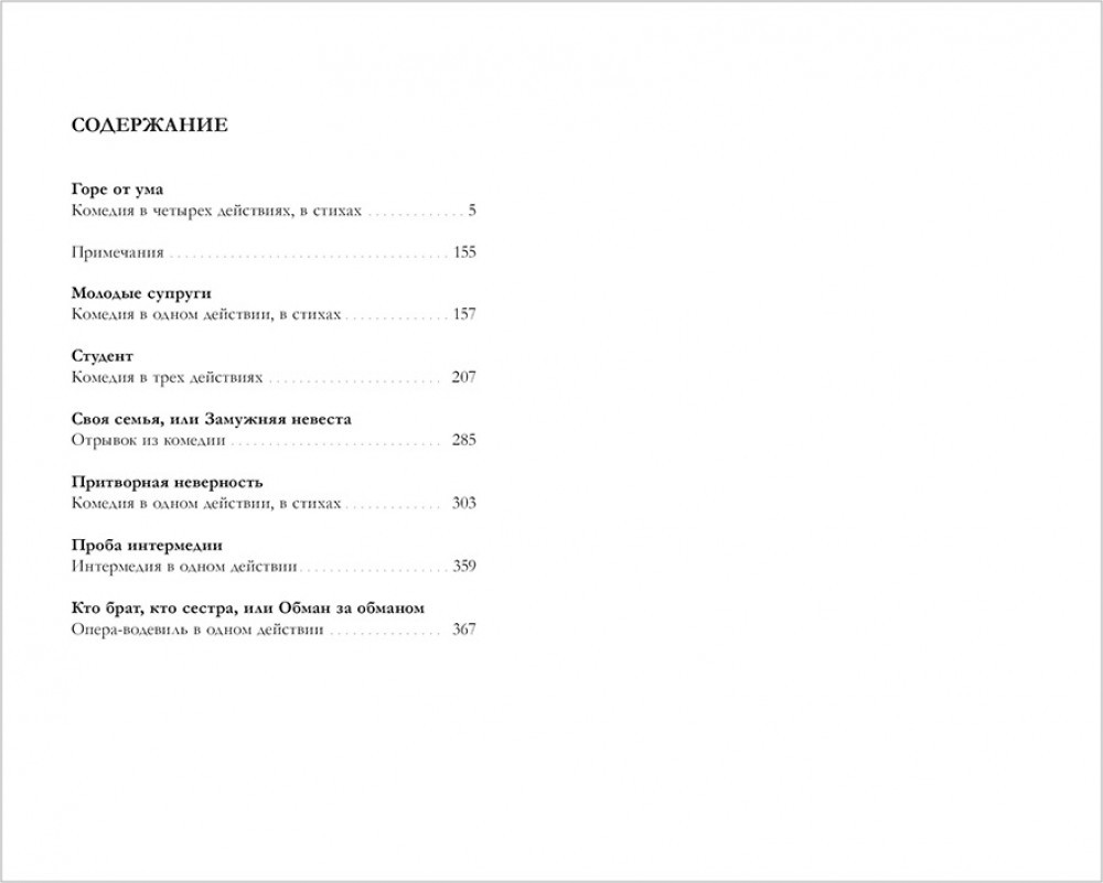 В сборник также вошли другие произведения А. С. Грибоедова: «Молодые супруги», «Студент», «Своя семья, или Замужняя невеста», «Притворная неверность», «Проба интермедии», «Кто брат, кто сестра, или Обман за обманом».