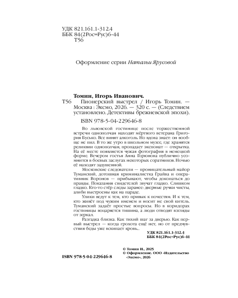 💳 Оплатить за товар можно при получении 🇰🇿 Есть бесплатная доставка по Казахстану от 1 дня 🎁 Копите бонусы с каждой покупки Серия: Следствием установлено. Детективы брежневской эпохи В 1973 году во львовской гостинице после торжественной встречи однополчан находят мертвого ветерана Григория Бусько — все винят алкоголь, но вдова знает: он не пил ни капли. В тот же день в школьном музее пропадает военная открытка, замененная подозрительным фото в немецкой форме. Вечером гостья Анна Горюнова публично усомнится в подвигах некоторых ветеранов — и ночью ее душат. Московские следователи — проницательный майор Туманский, дотошная криминалистка Грайва и оперативник Воронов — берутся за дело, где показания слишком гладки, алиби выстроены идеально, а следы стерты заранее. Разоблачения ведут к тем, кто живет под чужими именами и носит не свои кители, раскрывая тени предательства в западном форпосте СССР. |