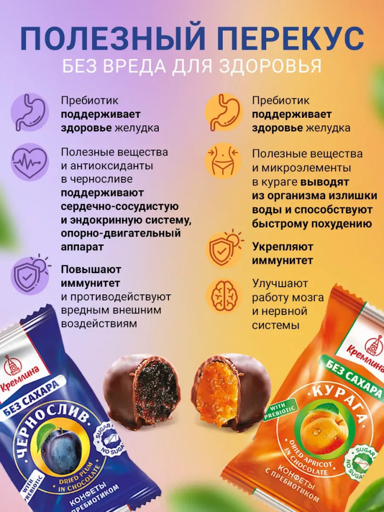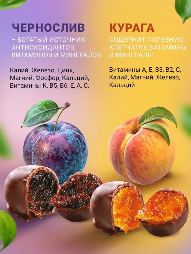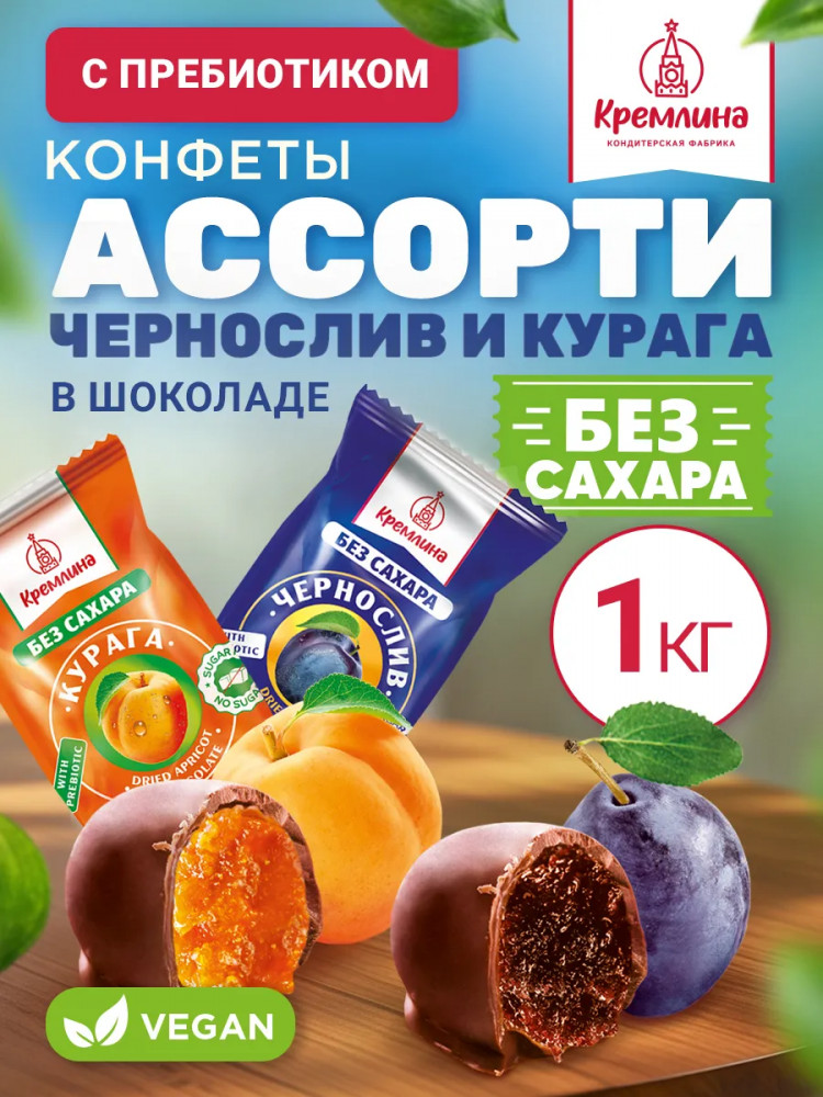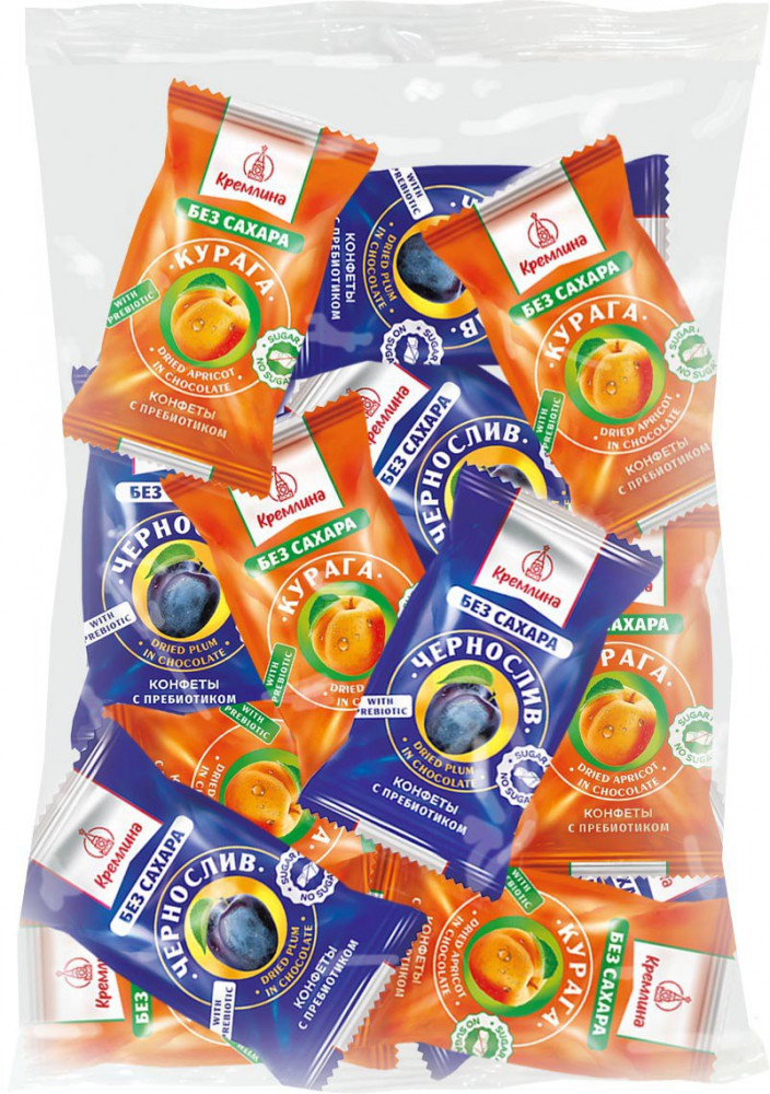 Конфеты в шоколаде «Курага без сахара»: абрикос сушёный (курага) (абрикос, консервант Е220). Глазурь какаосодержащая без сахара (подсластитель мальтит, заменитель масла какао лауринового типа, какао-порошок, эмульгаторы: лецитин соевый, Е476, ароматизатор «Ванилин», подсластитель стевиозид). Подсластитель. Пребиотик олигофруктоза. Фруктовый наполнитель (пюре фруктовое, патока крахмальная карамельная, регулятор кислотности: лимонная кислота, загуститель Е 1422, смесь подсластителей (сахарин, цикломат)). Ароматизатор «Курага».