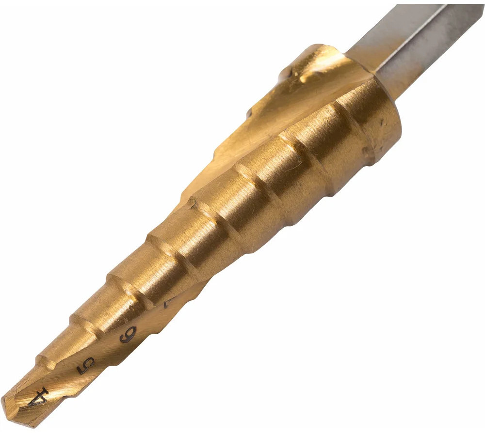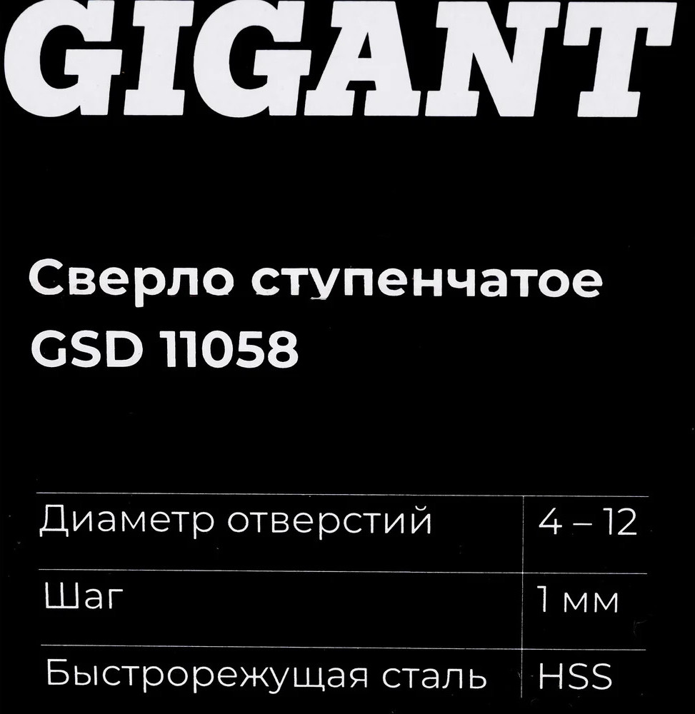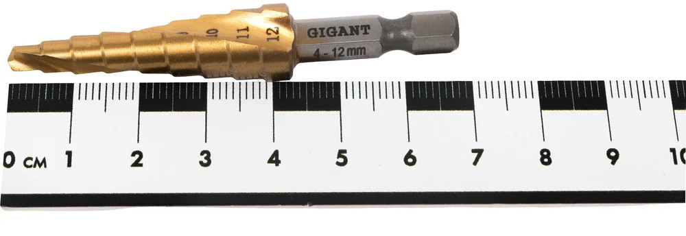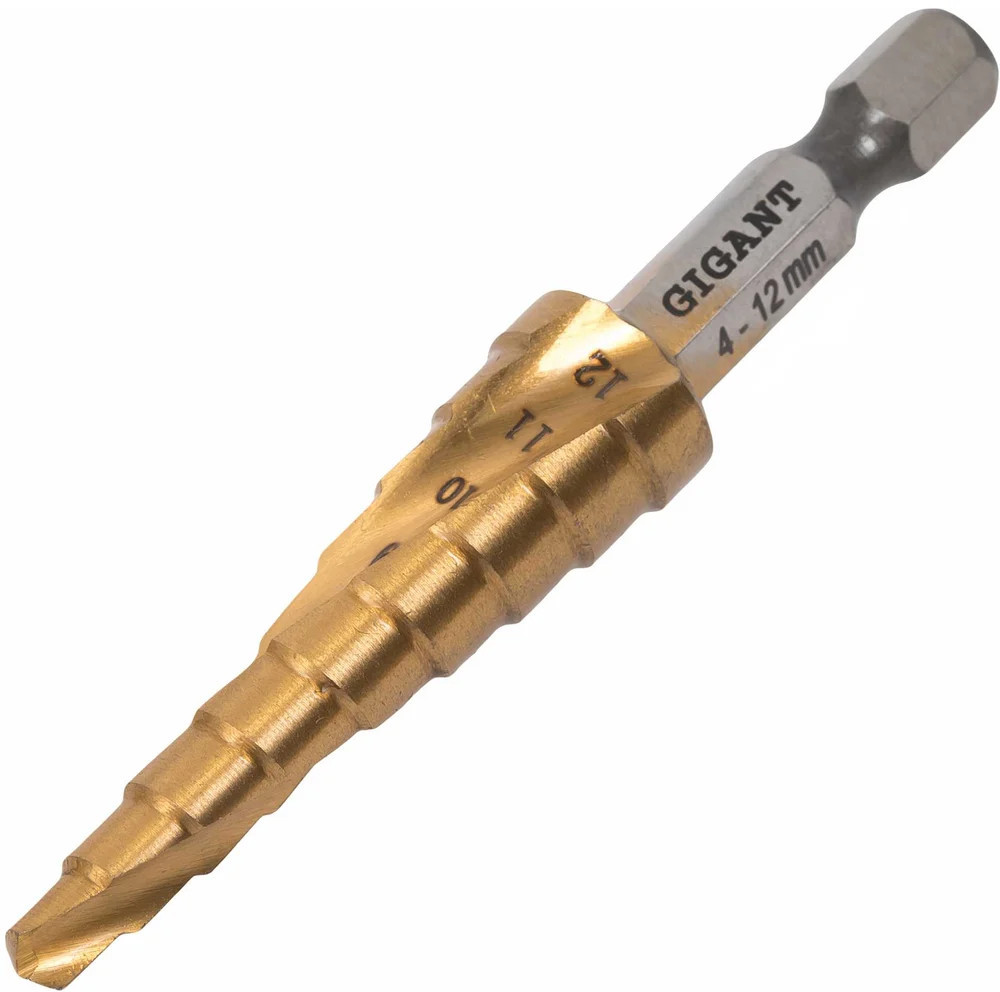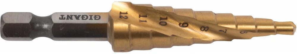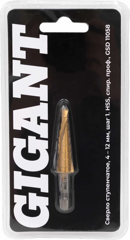 Сверло ступенчатое 4-12 мм, шаг 1. HSS, спиральный проф. Gigant GSD 11058 позволяет получать отверстия диаметром 4-5-6-7-8-9-10-11-12 мм в материалах толщиной до 5 мм: стали, цветных металлах, нержавейке и пластике. Благодаря плавному ступенчатому переходу и возможности сразу снять фаску отверстие получается аккуратным и имеет ровные края.