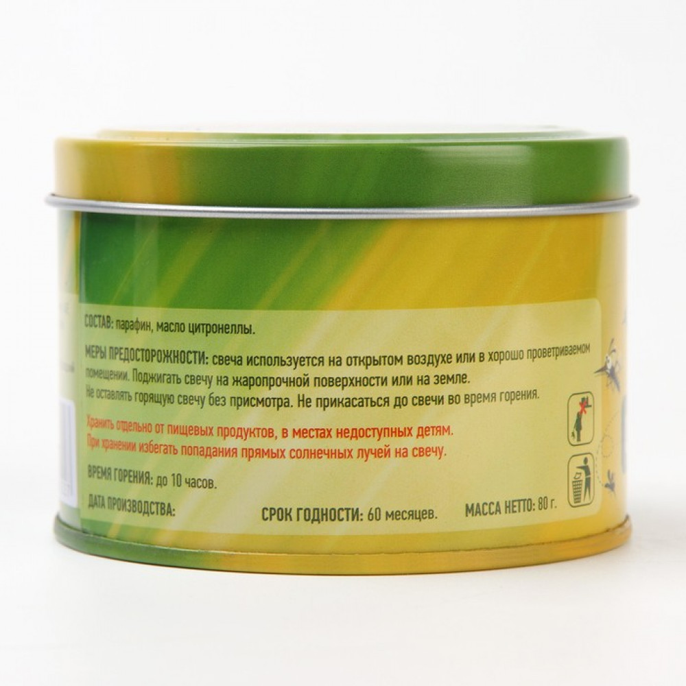 💳 Оплатить за товар можно при получении 🇰🇿 Есть бесплатная доставка по Казахстану от 1 дня 🎁 Копите бонусы с каждой покупки Свеча от комаров ARGUS garden обеспечивает защиту от комаров на открытом воздухе и в жилых помещениях в течение всего времени горения (10 часов)Состав : парафин, масло цитронеллы. Меры предосторожности: свеча используется на открытом воздухе или в хорошо проветриваемом помещении площадью 25 м3. Поджигать свечу на жаропрочной поверхности или на земле. Не оставлять горящую свечу без присмотра. Не прикасаться до свечи во время горения. Хранить отдельно от пищевых продуктах в местах не доступных детям. При хранении избегать попадания прямых солнечных лучей на свечу. Время горения до 10 часов. |