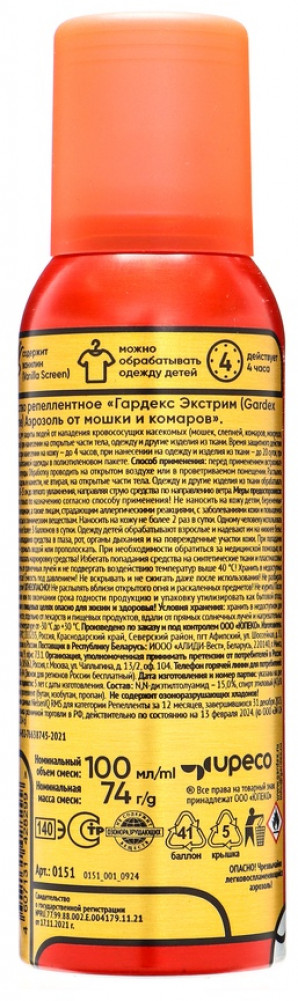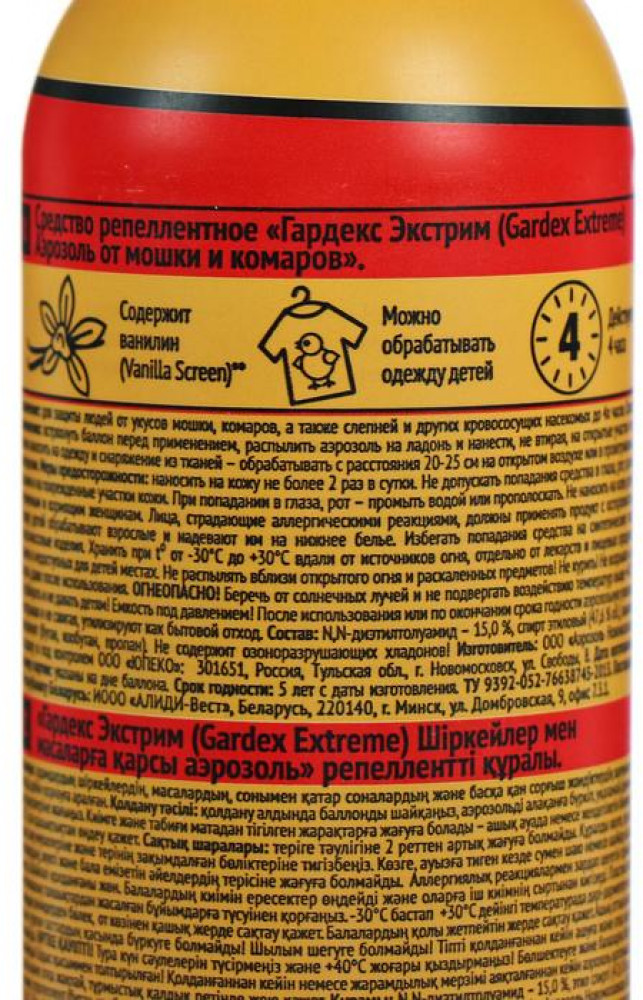💳 Оплатить за товар можно при получении 🇰🇿 Есть бесплатная доставка по Казахстану от 1 дня 🎁 Копите бонусы с каждой покупки Аэрозоль репеллентный «Gardeх Eхtreme», 2 в 1, от комаров и мошек, 100 мл. Аэрозоль от торговой марки Gardeх обеспечит надёжную защиту от укусов мошек, комаров, слепней, мокрецов и москитов. Распыляйте средство на открытые участки кожи, одежду и снаряжение из натуральных тканей. |