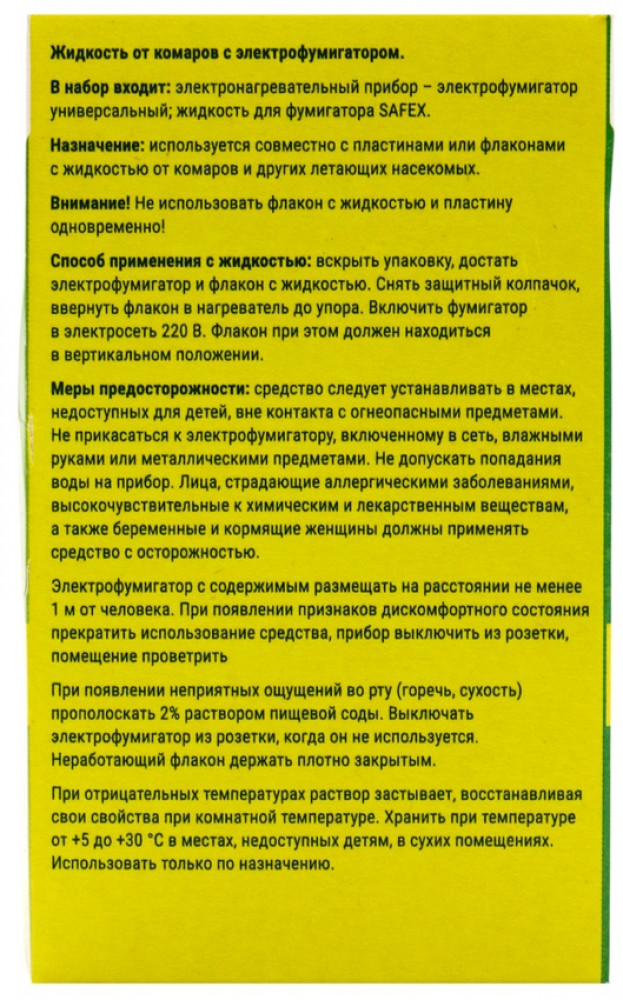 💳 Оплатить за товар можно при получении 🇰🇿 Есть бесплатная доставка по Казахстану от 1 дня 🎁 Копите бонусы с каждой покупки Комплект для фумигатора SAFEX (фумигатор + жидкость) — это готовое решение для защиты от комаров в комнате. Набор включает устройство и сменный баллон с жидкостью для длительного действия. Готовый набор для начала работы: в комплект входит сам фумигатор (электрическое устройство с нагревательным элементом) и флакон с жидкостью. Это позволяет начать использовать защиту сразу после покупки, без необходимости докупать что-либо отдельно. Принцип работы — испарение инсектицида: при включении фумигатор нагревает пластину, пропитанную жидкостью, или испаряет саму жидкость из флакона. В воздух поступает безопасное для человека и домашних животных, но эффективное против комаров количество инсектицида, которое создает в помещении защитную зону. |