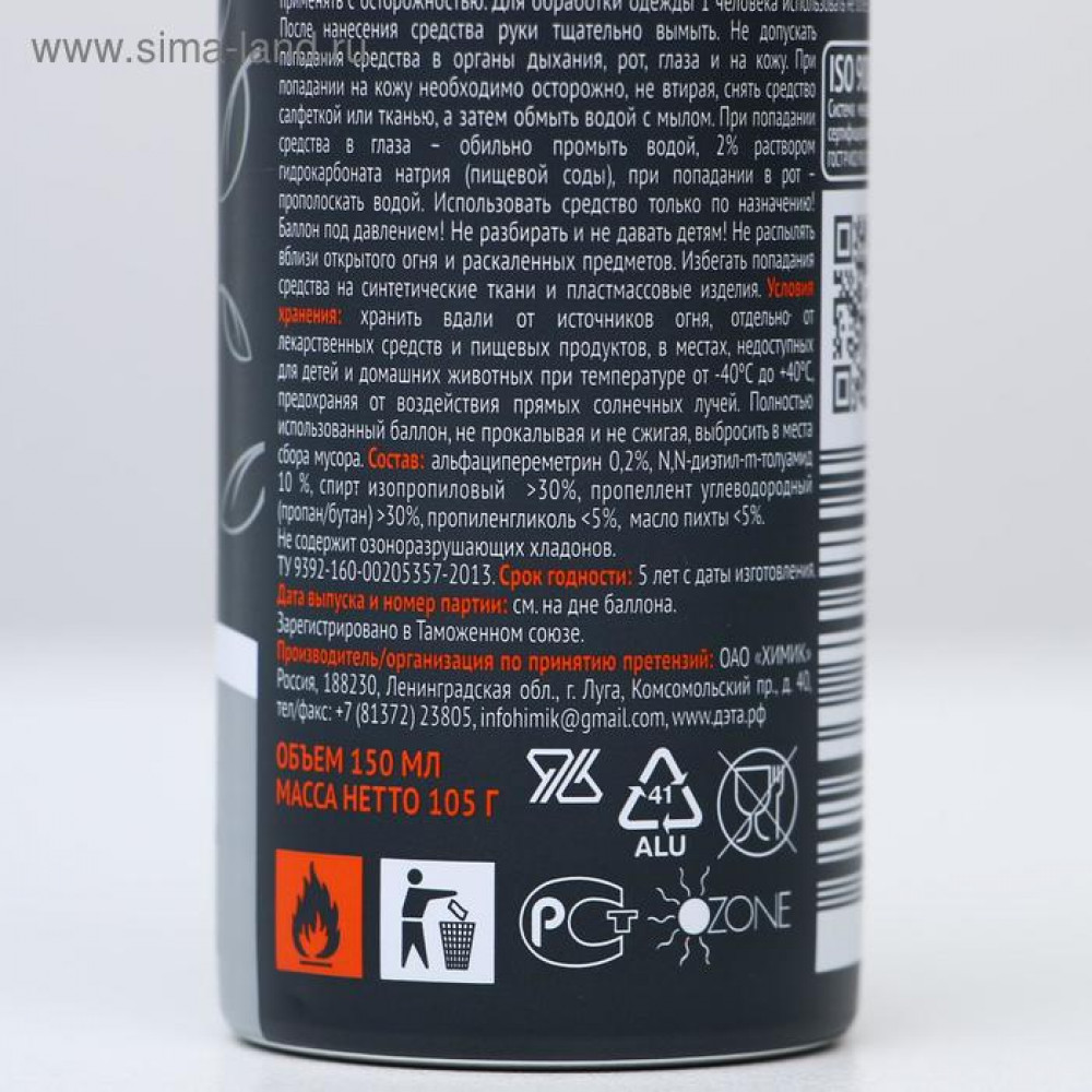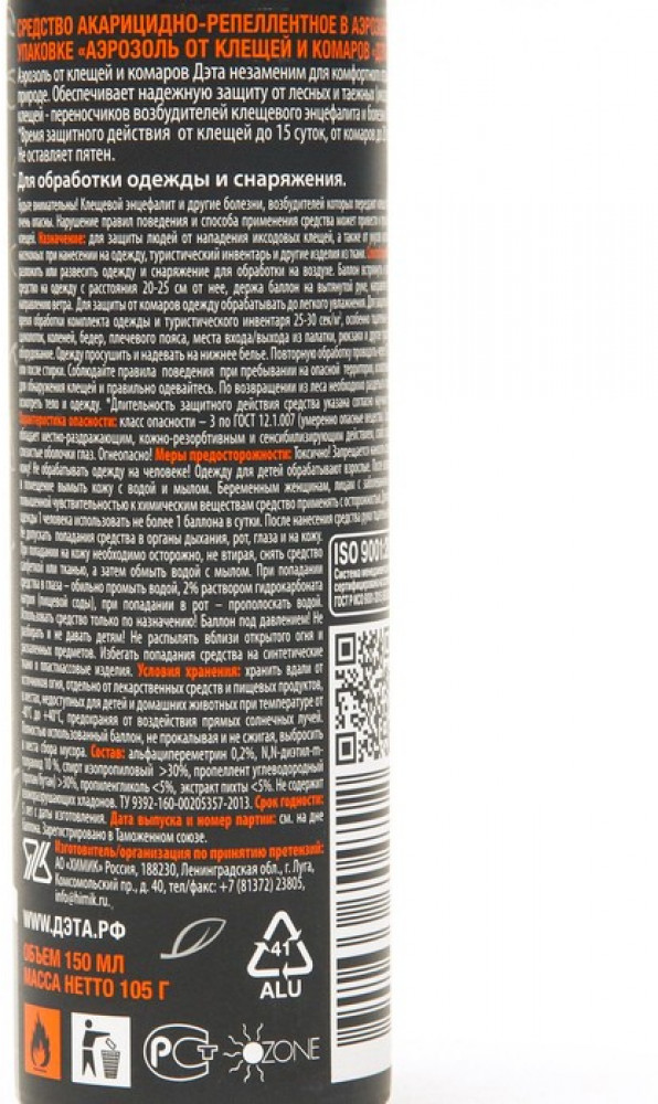 💳 Оплатить за товар можно при получении 🇰🇿 Есть бесплатная доставка по Казахстану от 1 дня 🎁 Копите бонусы с каждой покупки Акарицидно-репеллентное средство. Обеспечивает надежную защиту от лесных и таежных (иксодовых) клещей — переносчиков и возбудителей клещевого энцефалита и болезни Лайма. Не оставляет пятен на тканях. Для обработки одежды и снаряжения. Для обработки разложите или развесьте одежду или снаряжение на воздухе или в проветриваемом помещении. Расположите одежду и направьте струю по направлению ветра. Баллон встряхнуть и распылить препарат на одежду с расстояния 10-20 см от нее, держа баллон на вытянутой руке. Общее время обработки брюк и рубашки не более 2-х минут. Особое внимание нужно обратить на обработку верхней части носков, брюк и манжет рубашки. Одежду просушить и надевать на нижнее белье. Повторную обработку проводить через 10-12 дней или после стирки. |