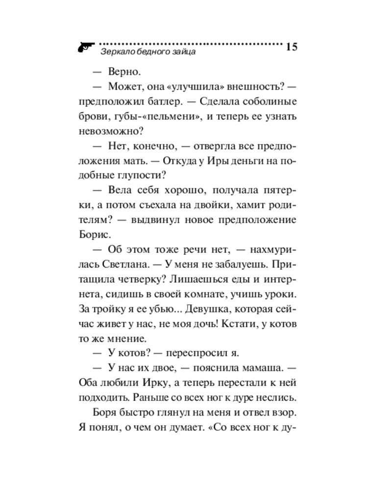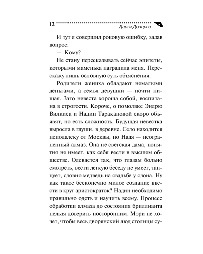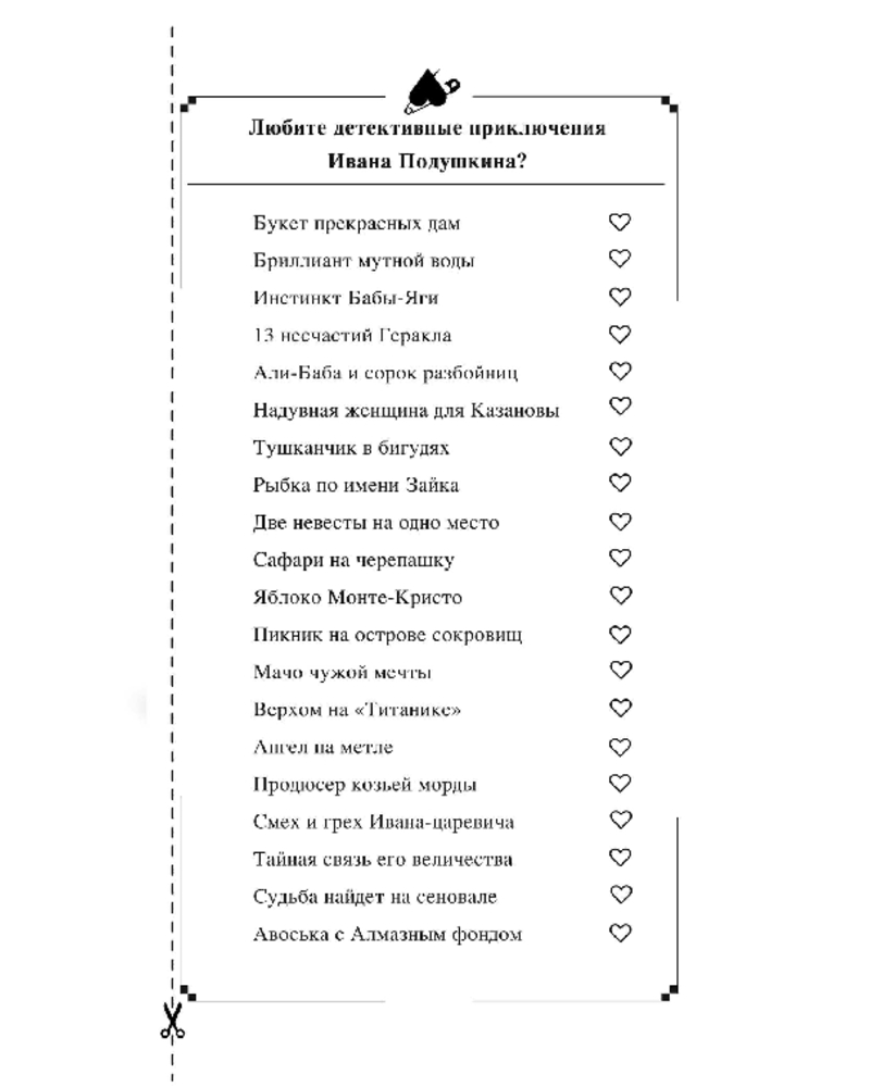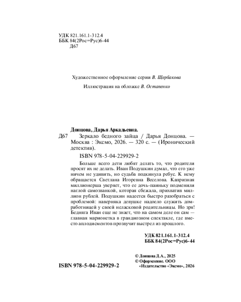 💳 Оплатить за товар можно при получении 🇰🇿 Есть бесплатная доставка по Казахстану от 1 дня 🎁 Копите бонусы с каждой покупки Серия: Иронический детектив (обложка) Больше всего дети любят делать то, что родители просят их не делать. Иван Подушкин думал, что его уже ничем не удивить, но судьба подкинула ребус. К нему обращается Светлана Игоревна Веселова. Капризная миллионерша уверяет, что ее дочь-паиньку подменили наглой самозванкой, которая сбежала, прихватив миллион рублей. Подушкин надеется быстро разобраться с проблемой: наверняка девушке надоело служить домработницей у своей неласковой родительницы. Но зря! Бедняга Иван еще не знает, что на самом деле он сам — главная марионетка в грандиозном спектакле, где вместо аплодисментов прозвучит выстрел из прошлого. |