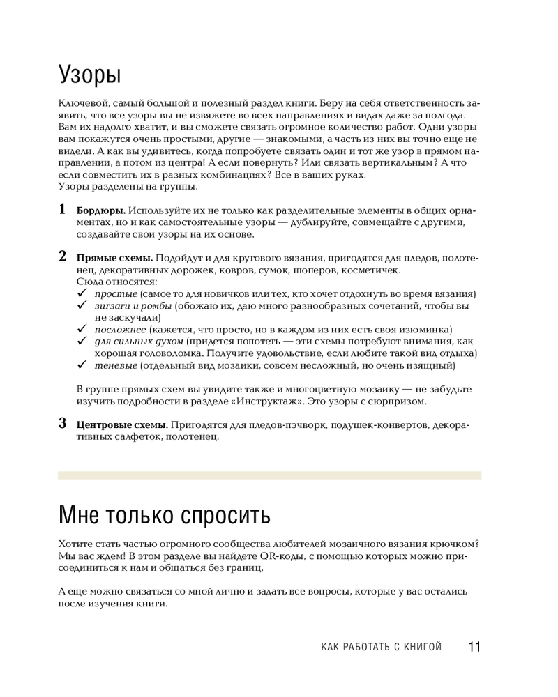 Кроме того, книга соединяет вас с большим сообществом: QR-коды внутри помогут присоединиться к движению любителей мозаичного вязания и задать вопросы лично автору. Откройте для себя мозаичное вязание — простую технику, которая делает ваши изделия яркими, выразительными и неповторимыми. |