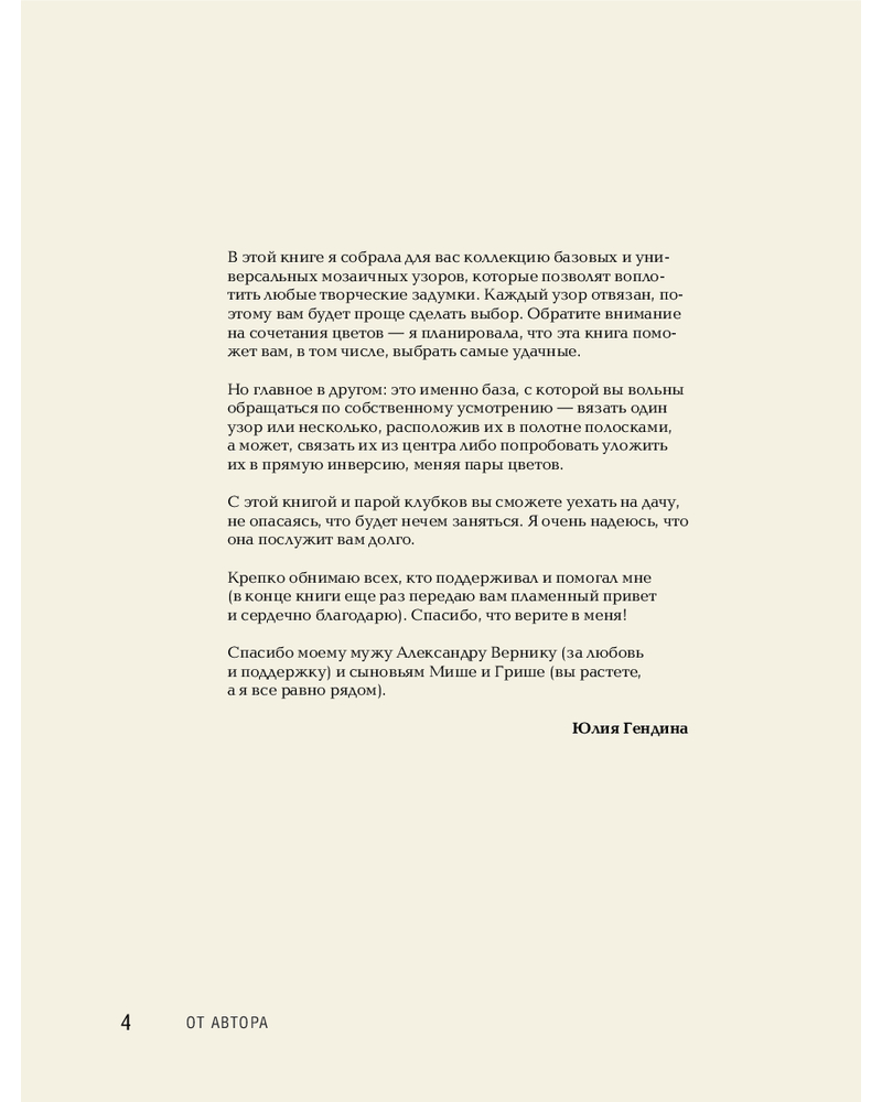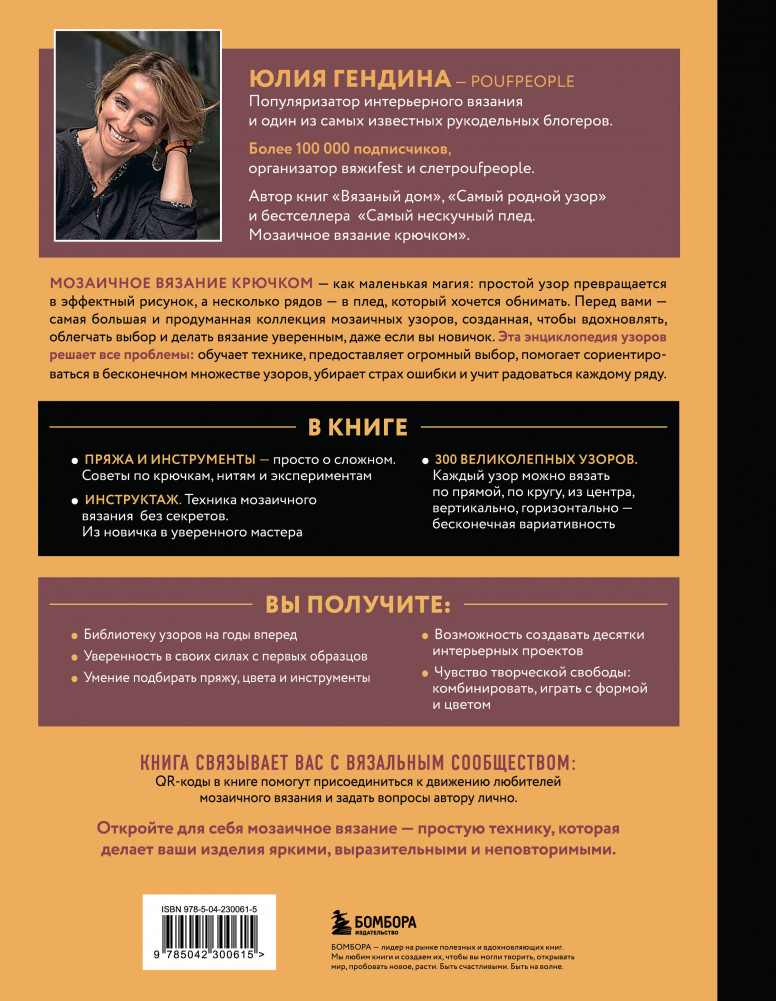 Серия: Звезды рукоделия. Юлия Гендина Хотите создавать интерьерные вещи с эффектом «вау», но боитесь запутаться в узорах и цветах? Эта книга — ваша карта в мир мозаичного вязания крючком. Юлия Гендина — популяризатор интерьерного вязания, автор бестселлеров «Самый нескучный плед» и «Самый родной узор», блогер с более чем 100 000 подписчиков, организатор #вяжиfest и #слетpoufpeople. Она учится у традиций, вдохновляется культурой Навахо и учит вязать с радостью, озорством и удовольствием.