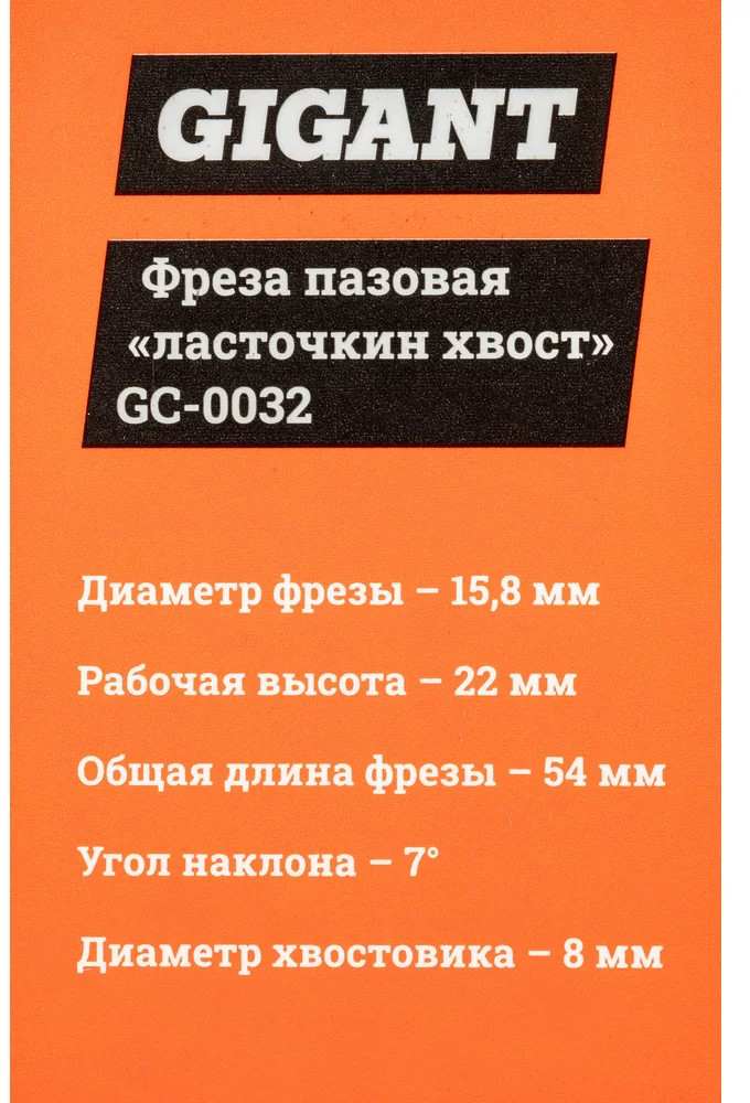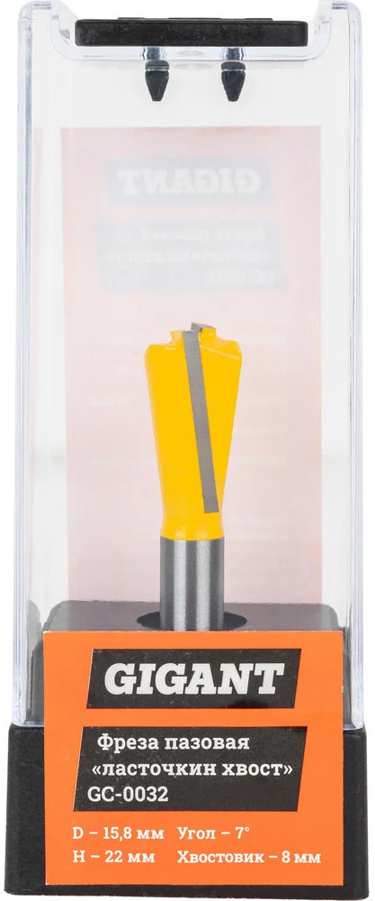 Фреза пазовая «ласточкин хвост» D15.8 H22 мм ∠7 хвостовик 8мм Gigant GC-0032 предназначена для выполнения шиповых соединений корпусной мебели, ящичных соединений, врезания поперечных планок. Широко применяется при реставрационных работах по антикварной мебели. Используется совместно с фрезерными машинами и фрезерными станками. Фреза изготавливается из высококачественных материалов и характеризуется точно рассчитанной геометрией режущей кромки, обработанной алмазными дисками до точности биения 0.02 мм. Структура твердого сплава гарантирует его высокую стойкость к выщерблению по режущей кромке и, следовательно, качество обработки изделия.