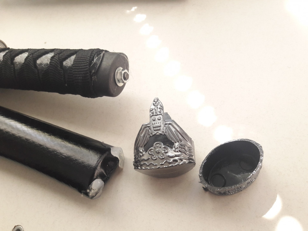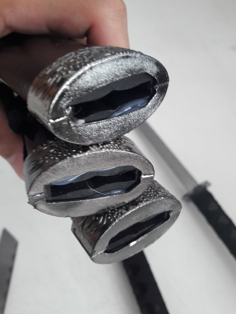 Крайне отвратительная работа. Никому не советую это покупать. Здесь отсутствует какая-либо заявка на качество. Пластик воняет, накладки пластиковые, они обвалились, потому что приклеены на термо сопли. Это в прямом смысле кусок железки, с каплей сварки , приделанная к детской игрушке. все накладки пластмассовые, кругом термоклей. И длина клинка это половина ножен. Можно было и не делать клинки, просто бы приклеили рукоятки к ножнам - смысл бы не изменился. люди, не тратьте на это свои деньги :))))