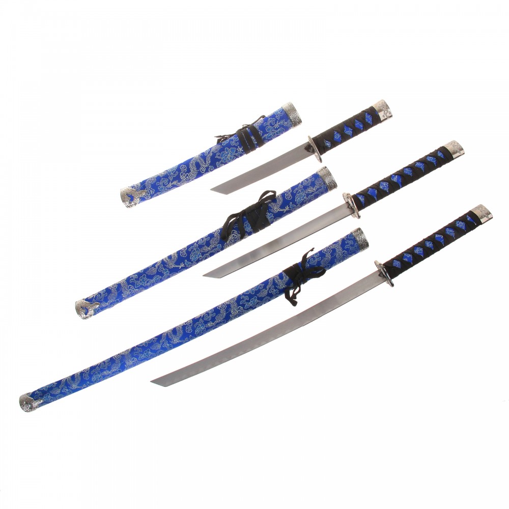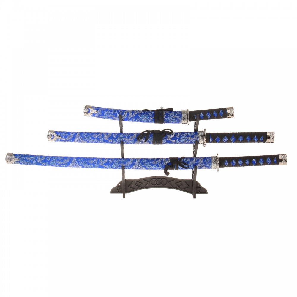 | Катаны сувенирные 3 в 1 на подставке, ткань, синие ножны, узоры с драконом+390 (бонусов)
