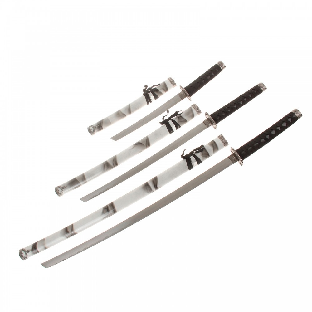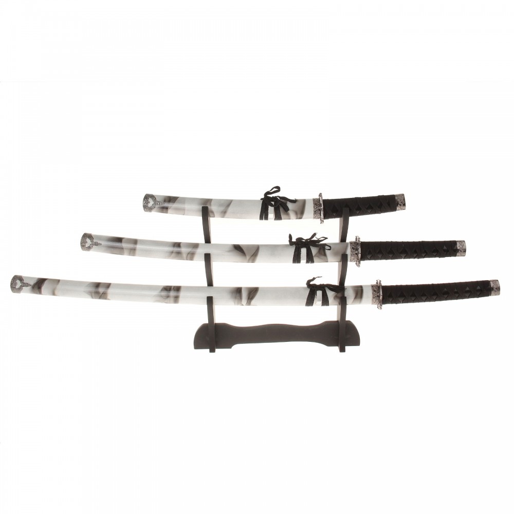 Катаны сувенирные 3 в 1 на подставке, белые ножны, черная дымка-25% +1037