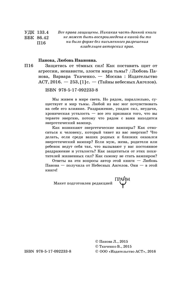 Защитись от тёмных сил! Как поставить щит от агрессии, ненависти, злости мира тьмы?Варвара Ткаченко, Любовь Ивановна Панова В данный момент этот товар отсутствует в продаже. Возможно, у нас найдется аналогичный или похожий товар здесь. Серия: Тайны небесных ангелов Мы живем в мире света. Но рядом, параллельно, существует и мир тьмы. Любой из нас мог почувствовать на себе его влияние. Раздражение, упадок сил, неудачи, хроническая усталость — все это признаки того, что вы теряете энергию, потому что рядом с вами находится энергетический вампир. |