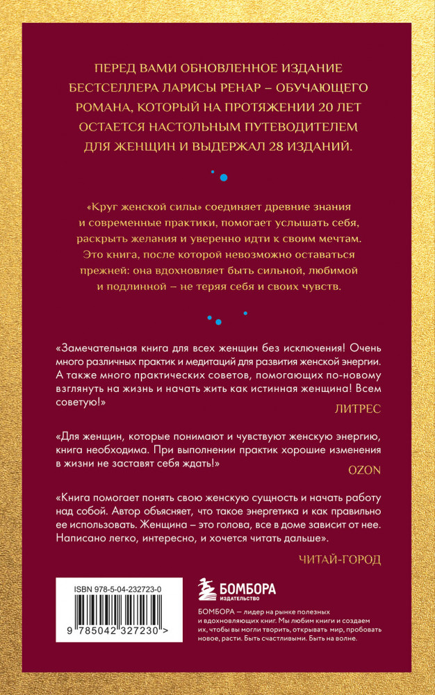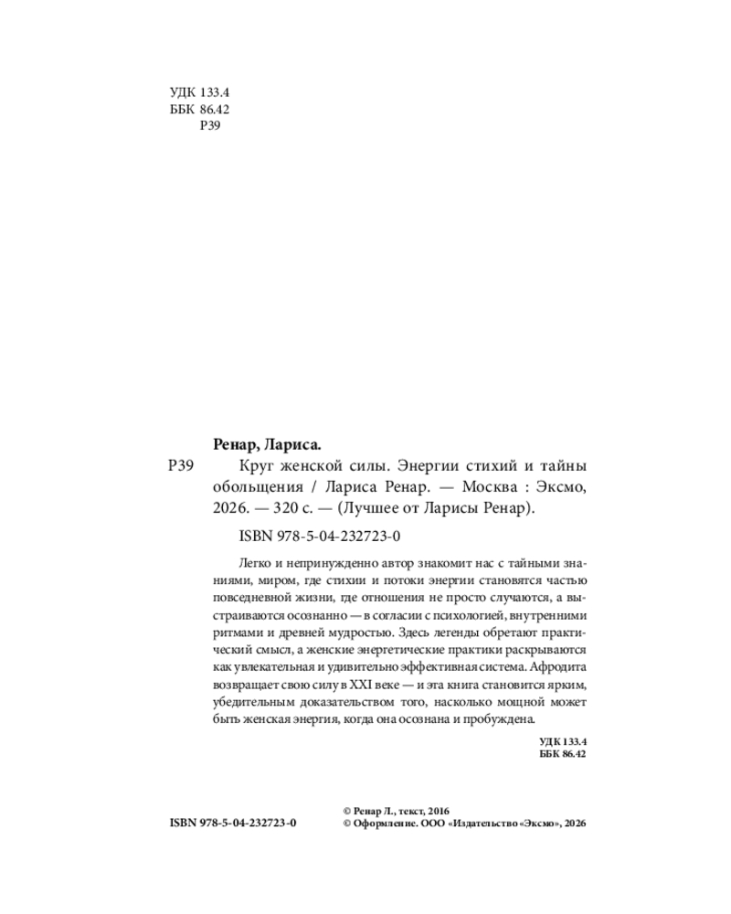 💳 Оплатить за товар можно при получении 🇰🇿 Есть бесплатная доставка по Казахстану от 1 дня 🎁 Копите бонусы с каждой покупки Серия: Лучшее от Ларисы Ренар «Круг женской силы» соединяет древние знания и современные практики, помогает услышать себя, раскрыть желания и уверенно идти к мечтам. Это книга, после которой невозможно оставаться прежней: она вдохновляет быть сильной, любимой и подлинной, не теряя себя и своих чувств. Она возвращает женщину к себе — к энергии, любви, гармонии и внутреннему вдохновению, открывая путь к той глубинной силе, которая всегда была внутри. |